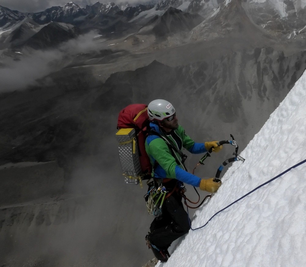 Am vierten Morgen konnten wir unsere Körper nur schwer in Gang bringen. Gleich die ersten Meter führten über Felsschwellen, die altes hartes Eis ausfüllte. Die Spitzen zu überreden, dass sie halten, kostete viel Kraft. Nach 100 m folgte das, was wir schon am Vortag ausprobierten. Eisfirn in einem Winkel von 70°, stellenweise auch mehr. Es schien, als würde der Berg vor uns ständig wachsen, statt kleiner zu werden. Irgendwo muss aber auch er ein Ende haben. Und richtig. In den Nachmittagsstunden überwanden wir den letzten Aufschwung und plötzlich standen wir auf einem scharfen First, der uns einen außergewöhnlichen Anblick der Welt auf der anderen Seite bot. Es war sehr windig und die Temperatur sank tief unter Null.