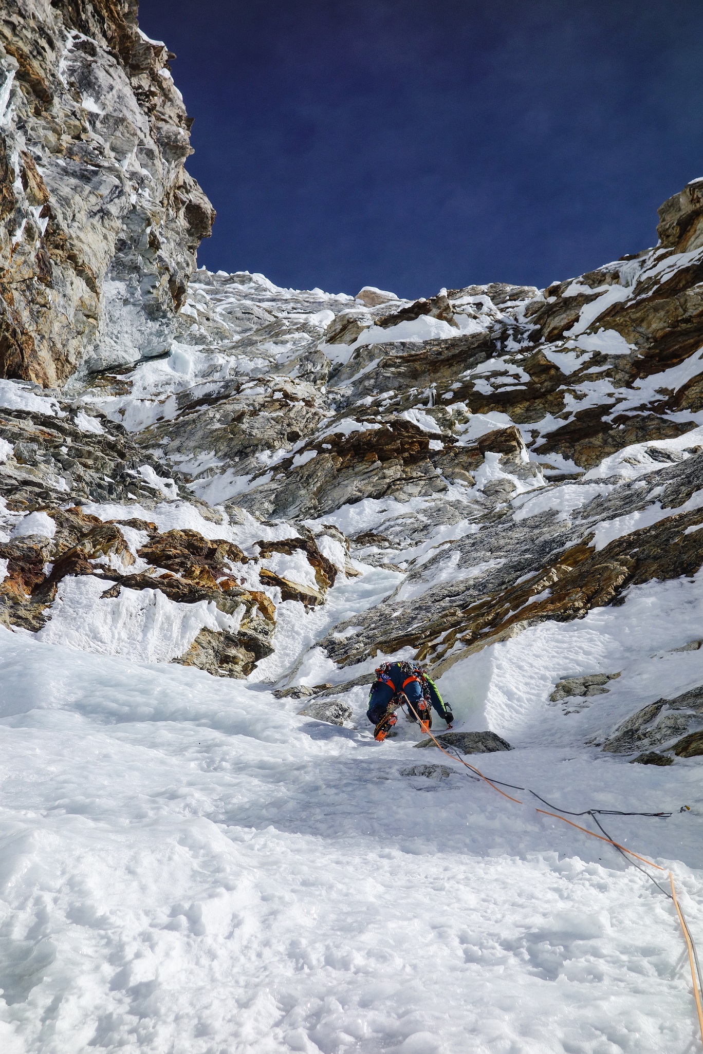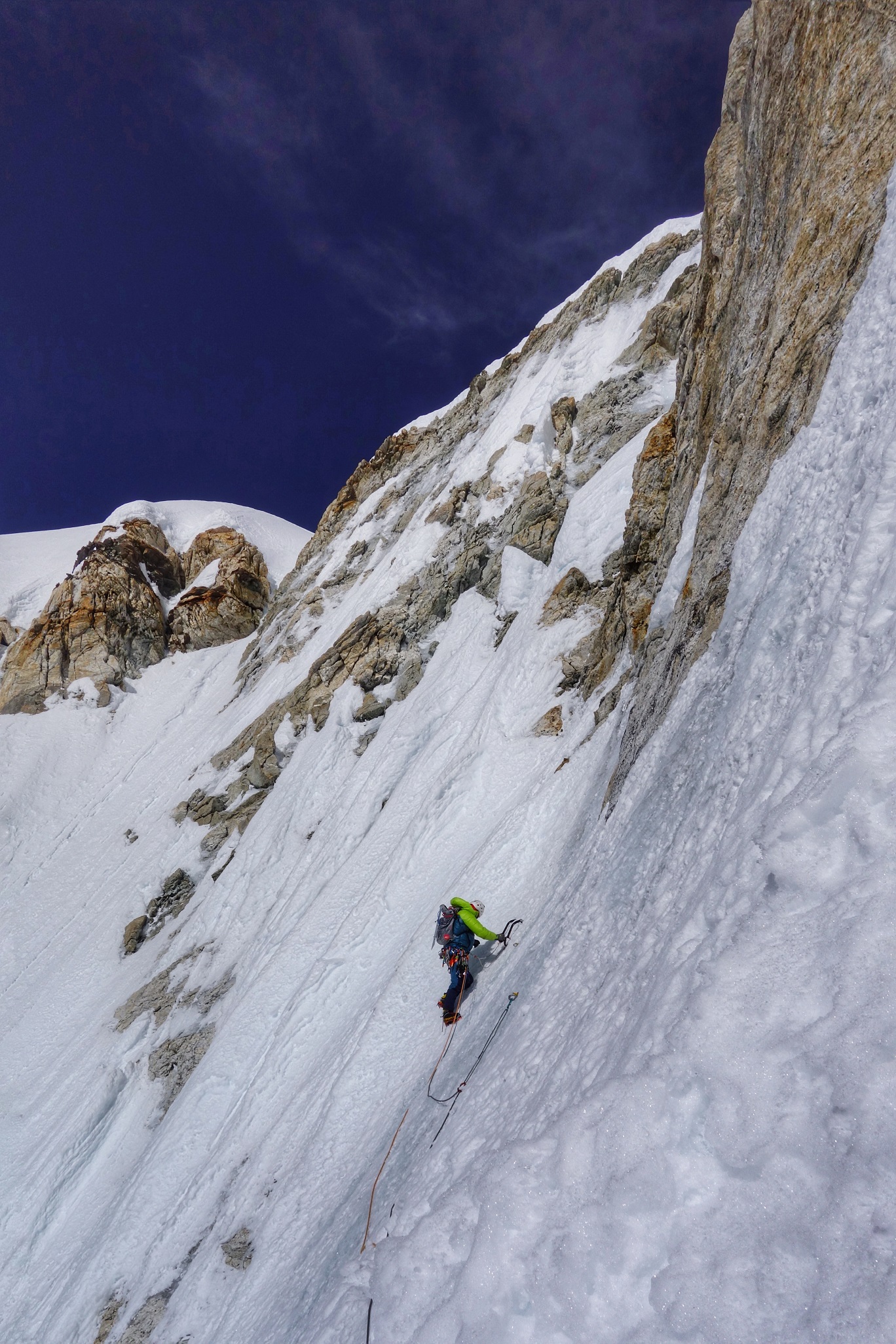 und steigen über senkrechtes Eis und technisch anspruchsvolle Felspassagen. Kurz vor dem Gipfel fordern