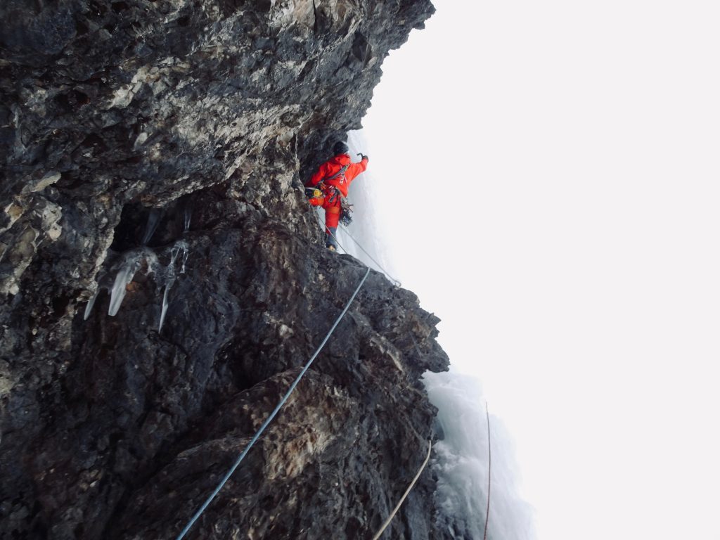 Leichter Schneefall und leichte Minustemperaturen waren kein nennenswertes Problem. Im Vergleich zum ersten Mal waren die Bedingungen sogar beinahe angenehm. Die ersten 150m stiegen wir über unsere fixierten Seile auf. Die Schwierigkeiten im ersten Teil erreichen ca. den 4. Grad, wobei man beachten sollte, dass dieser Abschnitt reichlich Schnee bedeckt und nicht zu unterschätzen ist. Am Umkehrpunkt angelangt, ruhten wir uns nur kurz aus und kletterten schließlich zwei weitere Seillängen. Den erreichten Absatz hätten wir eigentlich als Biwak Platz nutzen wollen. Doch derselbe entpuppte sich als schmaler und heikler als ursprünglich angenommen. Wir entschlossen uns, weiter zu klettern, und womöglich sogar im Stirnlampenlicht einen Biwak Platz finden zu müssen. Um zur logischen Rampe zu gelangen, die uns Richtung „Niagara Führe“ leiten sollte, seilten wir uns an einem Fels Kopf 20 Meter ab. An diesem Kopf befand sich bereits eine Schlinge mit einem Karabiner. An der Rampe angelangt, ging es auf logischen Weg zunächst Richtung „Niagararoute“ und schlussendlich zum Eisfall, unserem Hauptziel. Wie man im Kletterjargon zu sagen pflegt, löste sich alles erstaunlich logisch auf. Weiter ging es diagonal zu einer auffallenden Verschneidung. Im Anschluss daran kletterten wir einen Rechtsbogen und streiften dabei stellenweise die Route „Dornröschen“. Trotz der eindrucksvollen Felsqualität gestaltete sich das Höhersteigen entlang dem mit Schnee bedeckten Felsen sehr heikel und abschnittweise kritisch. Doch Motivation und unser Wille die letzten Meter bis zum Band, dem möglichen Biwak Platz, zu schaffen, waren bemerkenswert. Das Zusammenspiel von Kletterei und Logistik, damit ist größtenteils das Hochziehen des schweren Biwak Materials gemeint, schien außergewöhnlich gut zu laufen. Voller Freude konnten wir letztendlich das ausgeprägte Band unter dem spektakulären Eisgebilde erreichen. Ebenda konnten wir ein relativ entspanntes Biwak einrichten. Wir bereiteten uns so gut wie möglich für die bevorstehende Nacht vor und ließen die geschafften Klettermeter gedanklich nochmals Revue passieren. Obwohl wir mit dem Geschafften am ersten Tag mehr als zufrieden waren, drängten sich auch Zweifel auf. Zweifel darüber ob die Kletterei entlang des steilen Eisfalles überhaupt möglich und einigermaßen absicherbar sein wird.