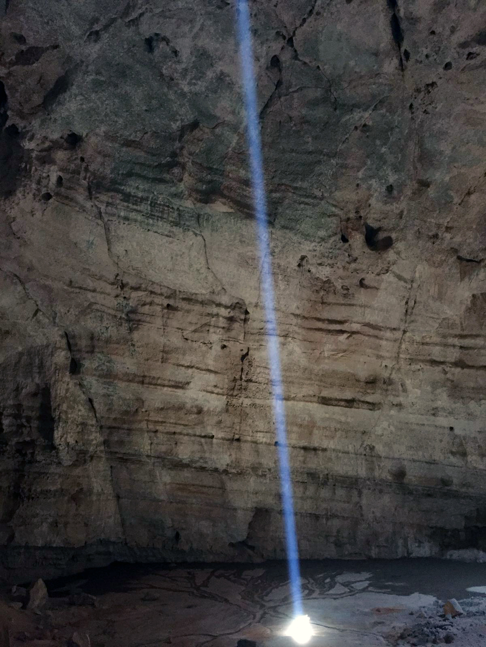 140 Meter schwebt man freihängend in den weitläufigen Hallenboden, gute vierhundert Meter im Durchmesser. Das einfallende Sonnenlicht erzeugt in der feuchten Höhlenluft magische Strahlen. Beeindruckend. Gewaltig. Der Ausstieg über die zweite Deckenöffnung schaut gut machbar aus, ideal um mit Keilen und Friends als Sicherungen auszukommen.