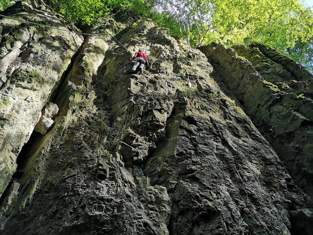 Das Klettergebiet ist ein kleines Kalkwändchen unterhalb der Burg Hohlenfels. Die Wand bietet Wand- und Plattenkletterei in 14 Routen im Grad 4. bis 8. Grad an kompaktem, relativ glattem Fels. Info und Foto von Tom Wille