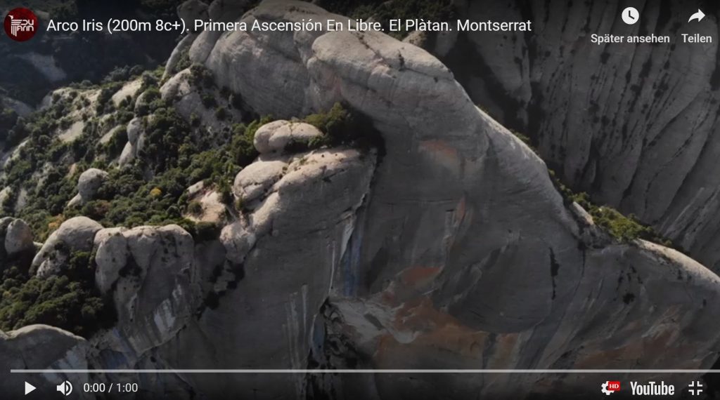 Edu Marin, sicherlich einer der besten MSL-Kletterer der Welt, kann mit „Arco Iris“ in Montserrat eine neue sehr schwere MSL-Route erschliessen. Die Route „Arco Iris“ (200m, 8c+) am El Plàtan
