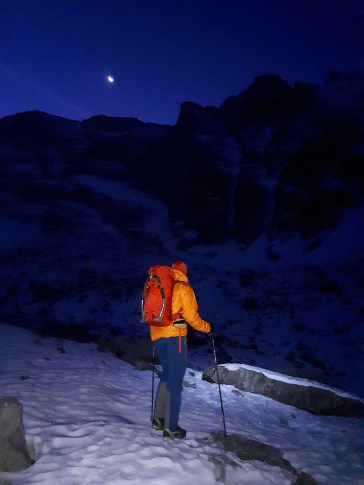 Wieder ein paar Stunden und unzählige hilfreiche Infos von Silvan später wackeln David und ich gegen 4 Uhr morgens zur Wand. Wobei wackeln in diesem verstrüppten und um mittlerweile 5 Uhr morgens wirklich erstaunlich dunklen Moränenschotter mehr auf meinen versteiften Gehapparat zutrifft, denn je. Aber irgendwann hat auch das ein Ende und wir stehen hechelnd mit heiß gelaufenen Waden unter der Verschneidung, die das eigentlich nicht Mal im Ansatz ist. David raucht erst mal eine, ich dagegen sitze da und frag mich, warum ich jetzt nicht Sportklettern bin. Die Antwort kommt sofort: Keine Ahnung.