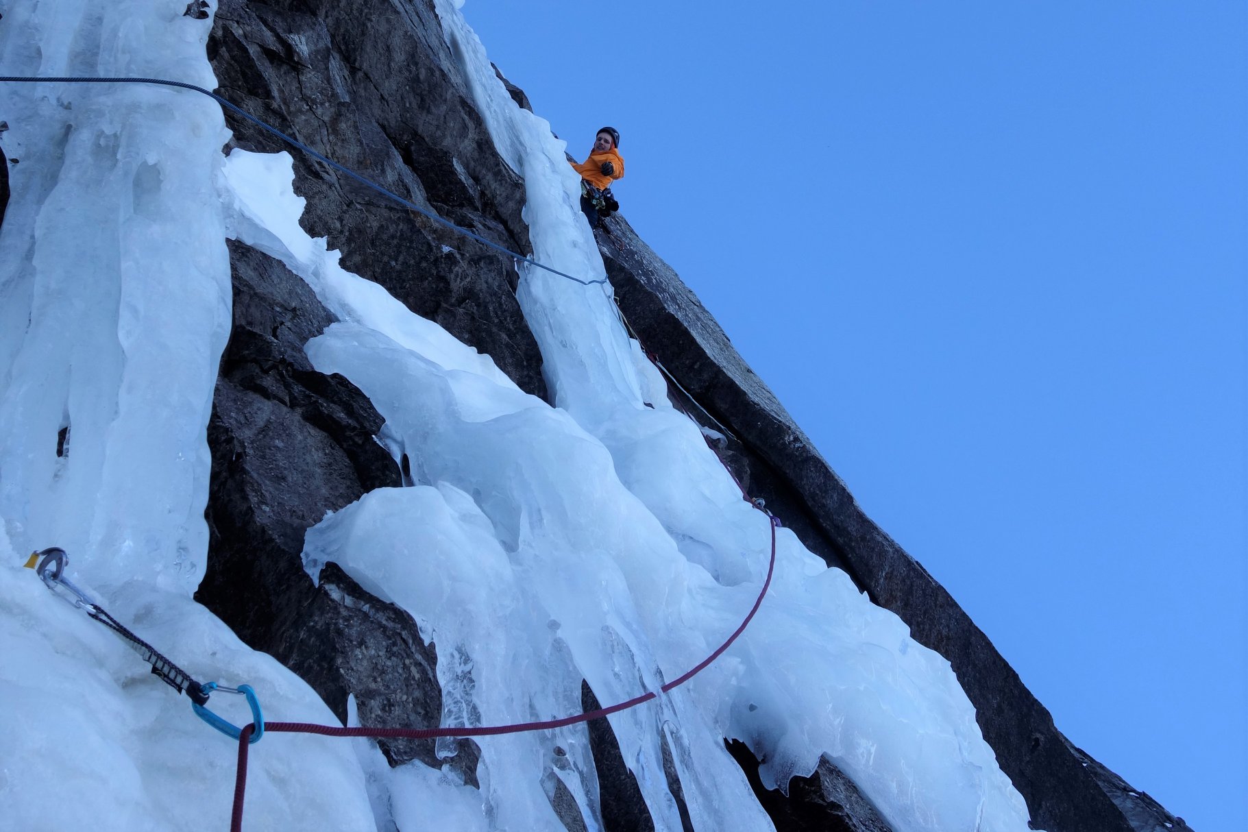 Na jetzt aber… zum Hauptteil. Nach der ersten blutigen Nachsteiger-Nase der Saison war ich dran. Und oh, das schaut ja gar nicht mehr so „flowig“ aus, am anderen Ende des Seils? Ich lege hier einen schlechten Cam, dort eine miese Eisschraube, klettere hoch und runter aber traue mich noch nicht so ganz auf den vollständig gelösten Eisstrukturen zu queren. Irgendwann schlage ich dann noch einen schlechten Haken dazu und weil 3 Mal schlecht mindestens ein Mal gut genug ergibt, geht’s endlich weiter. Nach einer kürzeren Länge von David Bruder ohne fix eingerichtetem Standplatz kommt eine der besten Mixed-Längen der Saison. Fast 50 Meter kombiniertes Gelände mit einer enorm ausgesetzten Querung an den gelösten Eisstrukturen und absolut delikat abzusichern. Wenn’s doch nur so weiter gehen könnte?