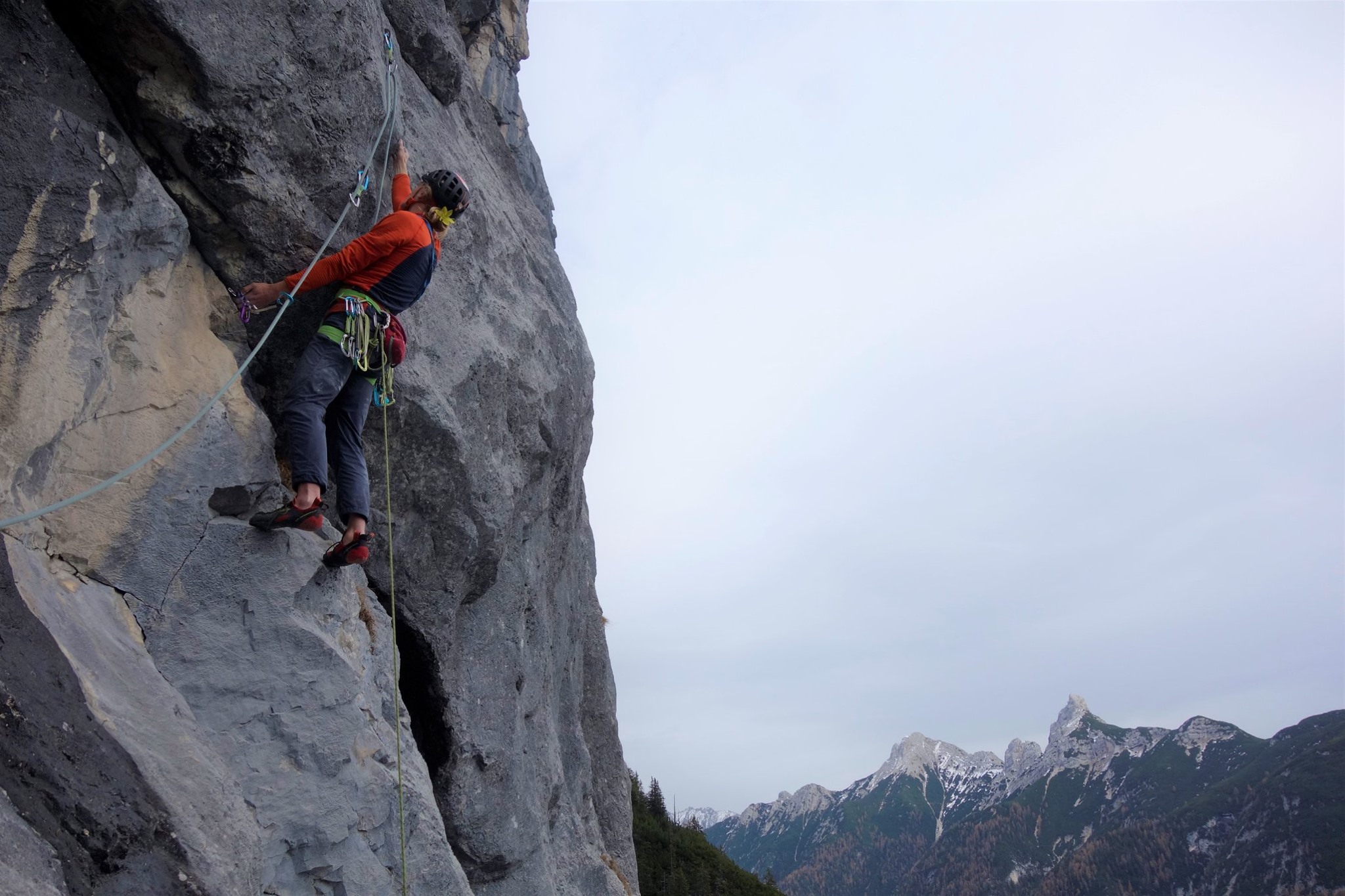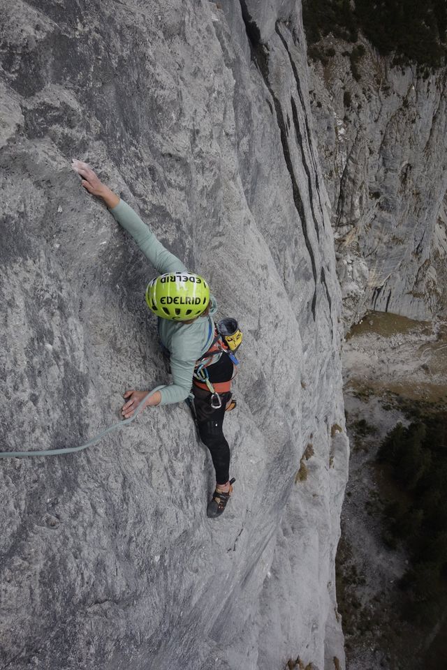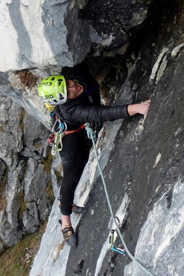 - Amelie am Beginn der Crux in der 4. Seillänge der „In Memoriam Matthias“. Sieht nicht so schwer aus? Eigentlich? Dachte Martin auch.