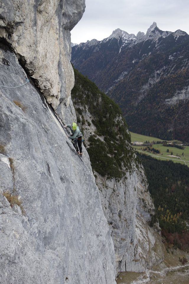 „Drei Jahre nach der insgesamt 5 Tage lang andauernden Erstbegehung von „Terrakottas Fluch“ (190m, 9-) und 2 ergebnislosen Versuchen in der „Sonne hinter dem Nebel“ (260m, 9) unterhalb vom Schüsselkar, habe ich es nie mehr zu dieser idealen Herbstwand geschafft. Erst im Rahmen eines Fotoshootings für den DAV Expedkader Frauen, bei dem sich Caro Neukam zusammen mit Janina Schmidt die 4. Wiederholung von „Terrakottas Fluch) (af) sicherten und nebenan Am Elie zum ersten Mal seit der Erstbegehung vor 12 Jahren eine kletterbare Lösung der A0-Stelle in der „In Memoriam Matthias“ gefunden hat, kamen wir zusammen diese Woche wieder zurück, um die letzte Techno-Stelle dieser Wand von ihrer Last zu befreien.