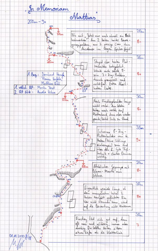 Dank Amelies starker Vorarbeit konnte ich die fürs Freiklettern etwas verbohrte 4. Seillänge völlig überraschend im flash klettern, Amelie zog nach einem Griffausbruch am letzten Zug im 3. Versuch nach und sicherte mich im aufziehenden Nieselregen die letzten 3 noch fehlenden und allesamt knüppelhart bewerteten Seillängen bis zum Ausstieg. Damit gelang die wahrscheinlich 1. vollständige Rotpunkt-Begehung von „In Memoriam Matthias“ (200m, 9+), wobei ich die 2. Seillänge (8+) im Nachstieg und die 6. Länge im 2. Versuch geklettert bin.“