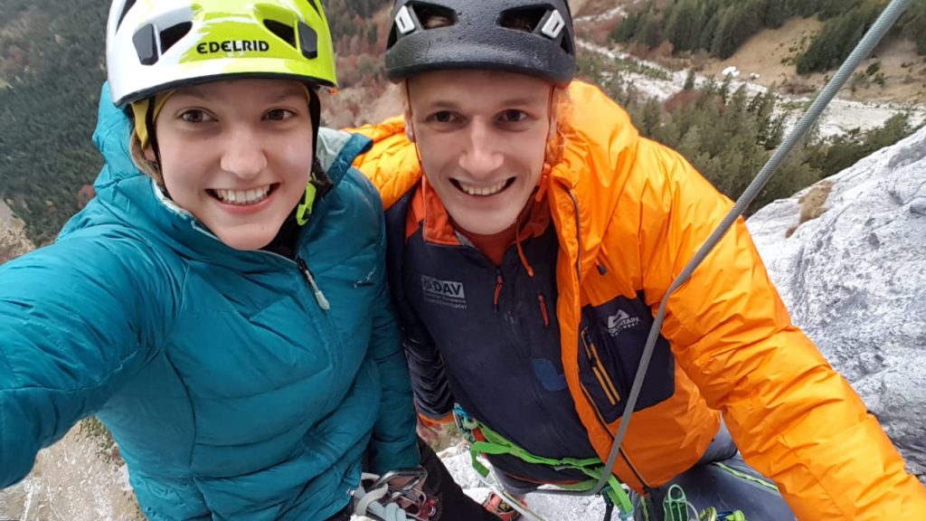 Dank Amelies starker Vorarbeit konnte ich die fürs Freiklettern etwas verbohrte 4. Seillänge völlig überraschend im flash klettern, Amelie zog nach einem Griffausbruch am letzten Zug im 3. Versuch nach und sicherte mich im aufziehenden Nieselregen die letzten 3 noch fehlenden und allesamt knüppelhart bewerteten Seillängen bis zum Ausstieg. Damit gelang die wahrscheinlich 1. vollständige Rotpunkt-Begehung von „In Memoriam Matthias“ (200m, 9+), wobei ich die 2. Seillänge (8+) im Nachstieg und die 6. Länge im 2. Versuch geklettert bin.“