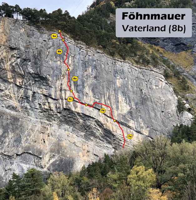 Föhnmauer – Vaterland 8b (7c obl.) – 7 SL, 200m – Daniel Benz 2020