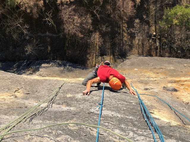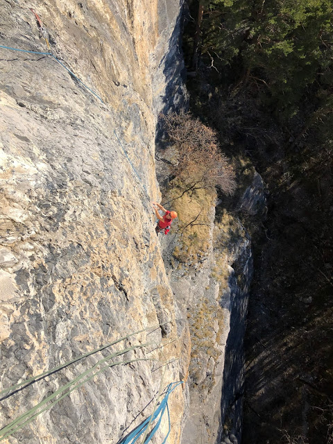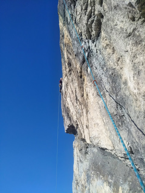 Als Nachsteiger hat man an dieser Stelle in L6 (8b) gut lachen, denn da ist die Sache eigentlich gelaufen, auch wenn die Abschlussplatte durchaus nicht ganz banal ist. Der Vorsteiger darf sich aber zusätzlich noch einem Runout gegenüberstellen, gewürzt noch mit der mentalen Belastung, sich hier die Begehung noch nehmen lassen zu müssen.