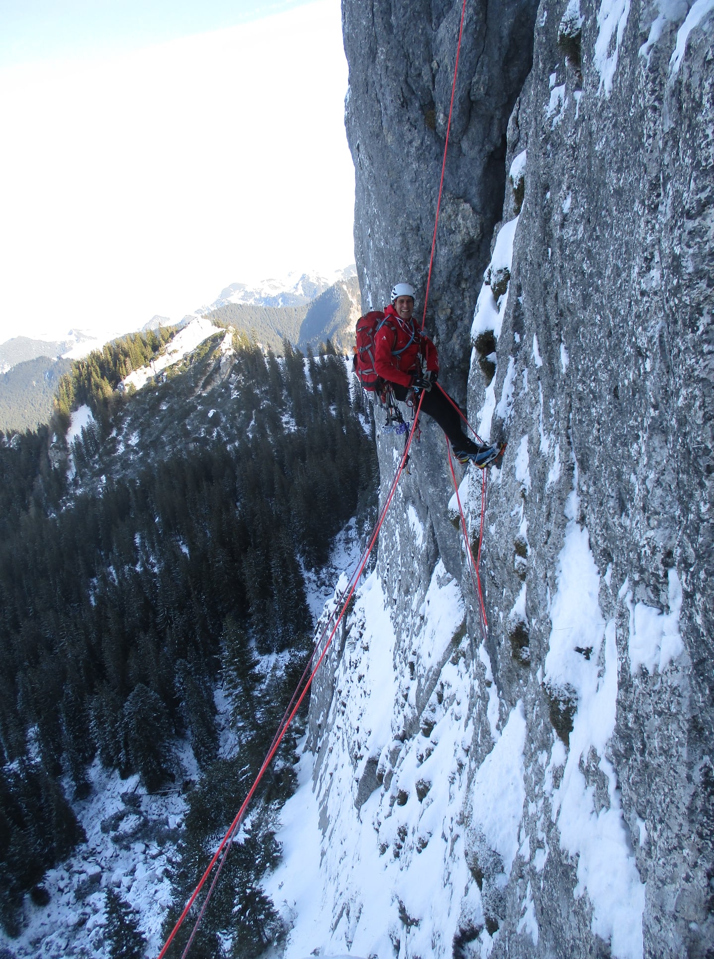 Die resultierende Einschätzung ist, dass unter diesem Bedingungen das Anklettern der Wasserrille frei doch recht schwer ist, aber mit den vorhandenen Bohrhaken, wenn auch etwas unangenehm, technisch geklettert werden kann. Wer also ungern technisch klettert oder sehr plattige M8 nicht wirklich mag, sollte besser im echten Winter und bei guter Schneelage mit Ski wiederkommen.