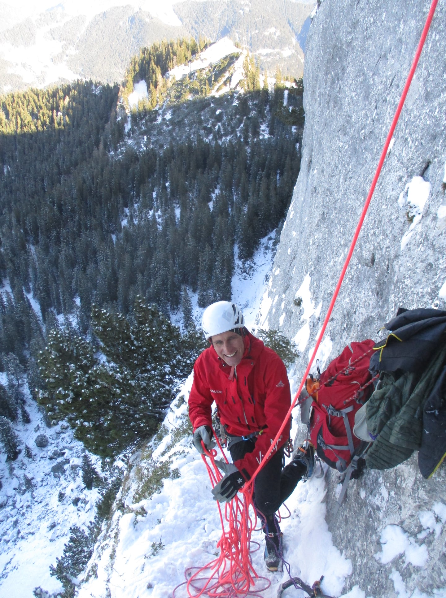 Bei der Erstbegehung vom „Wintertagtraum“ im Januar 2020 war die Schneelage so hoch, dass man direkt vom Einstieg die Doppel-Wasserrille des Sommer-Baseclimbs „Junggesellenabschied (5)“ erreichen konnte. So haben hatten die beiden diese existierende Länge genutzt, bzgl. BH unverändert belassen, und sind diese als Einstieg für die Neutour geklettert (M6). Bei herbstlichen Bedingungen wie derzeit (Dez. 2020) mit Minimal-Schneelage muss/kann die Wasserrille wie im Sommer ca. 6 m tiefer von rechts her angeklettert werden. Dazu sind drei weitere Bohrhaken von „Junggesellenabschied“ nutzbar (die im Januar 2020 unter Schnee verborgen waren). Allerdings ist diese 5er Reibungsplatte mit Steigeisen undankbar. Gestern (11.12.2020) waren drei Seilschaften vor Ort, dabei die 3 bekannten Isarwinkler Bergführer und Urgesteine Sebastian Brandhofer, Andreas Biberger und Moritz Filger.