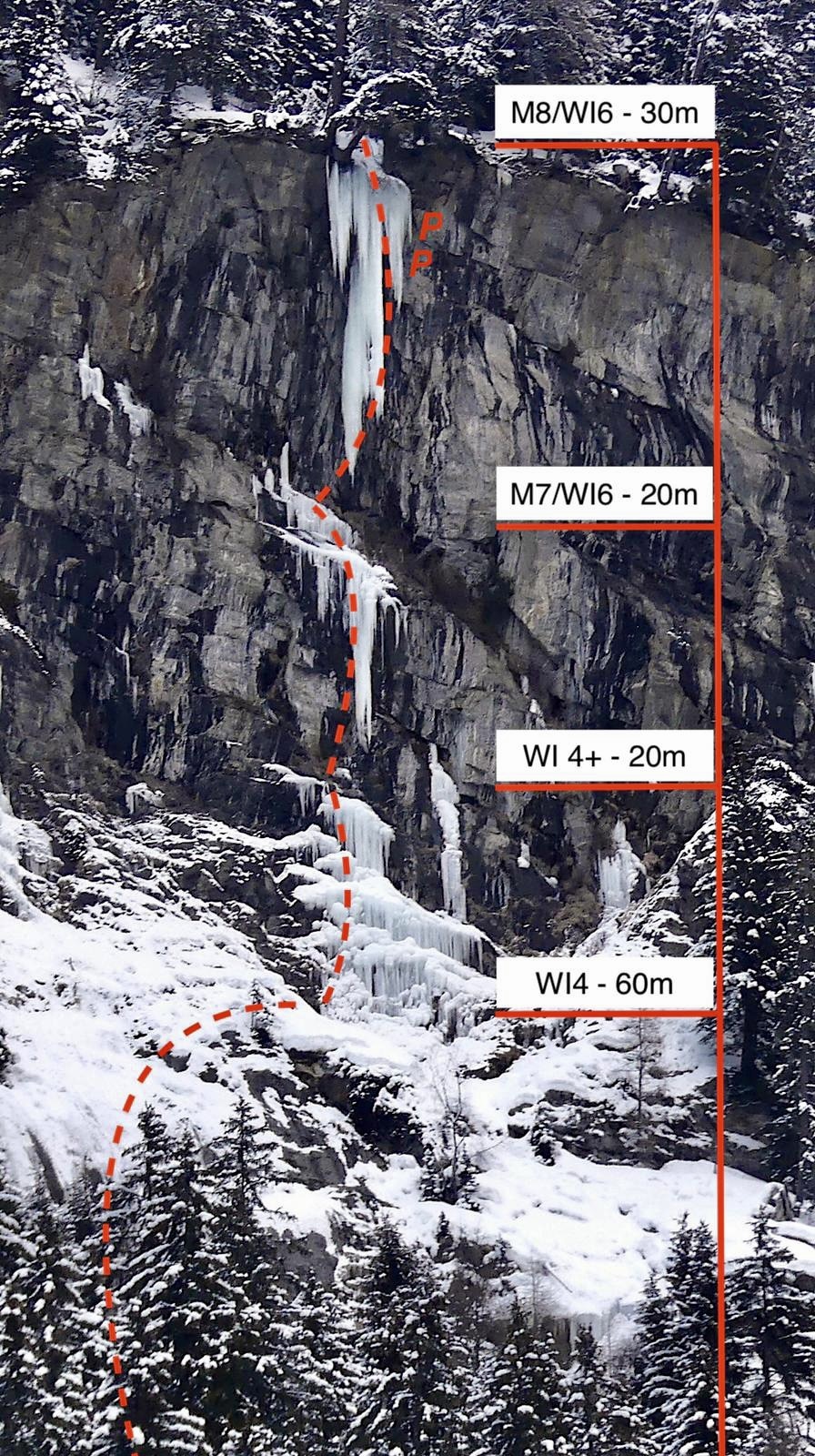 Den Charakter der Route lässt sich wie folgt beschreiben. Die Einstiegsseillänge und die darauffolgende Seillänge sind reine Eislängen, wobei die Zweite etwas anspruchsvoller ist als die Erste. Die dritte Länge bietet Mixed-Gelände im 7. Grad und einen Eisausstieg entlang eines steilen Zapfens. Die letzte Länge ist zugleich die schwierigste und steilste der Route. Zunächst klettert man im überhängenden Fels Teil hin zum steilen markanten Ausstiegsvorhang, der sachtes und überlegtes Klettern abverlangt. Dieser Zapfen bildet sicherlich das Herzstück der Route. Gleichzeitig unterstreicht dieser die Steilheit der Route.