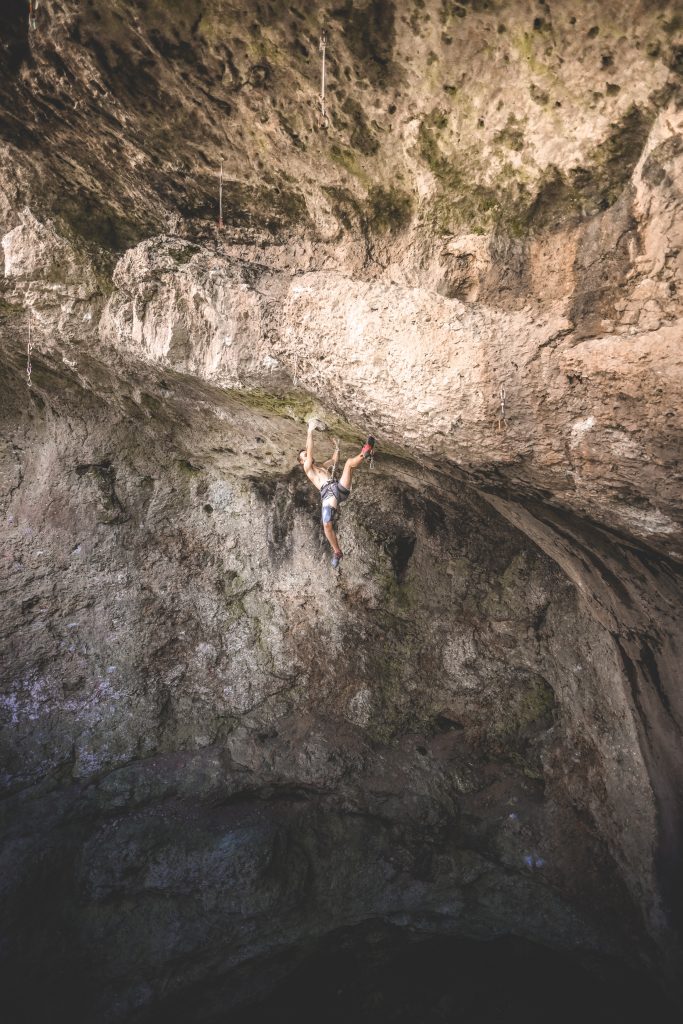 ”After checking the route for the first time I instantly knew that was the kind of line I was searching for. It’s a 25 meters high wall with a 10m roof in the middle that has just one pure sequence of holds to climb on. You basically climb some 7c to a no hands ledge, and after some easy approach it’s 10 consecutive hard moves through the roof. After that you have some 8a climbing to the top. At the beginning I was struggling a lot with the single moves, but after checking out everything perfectly it went faster than expected. In total it took me 6 sessions.”