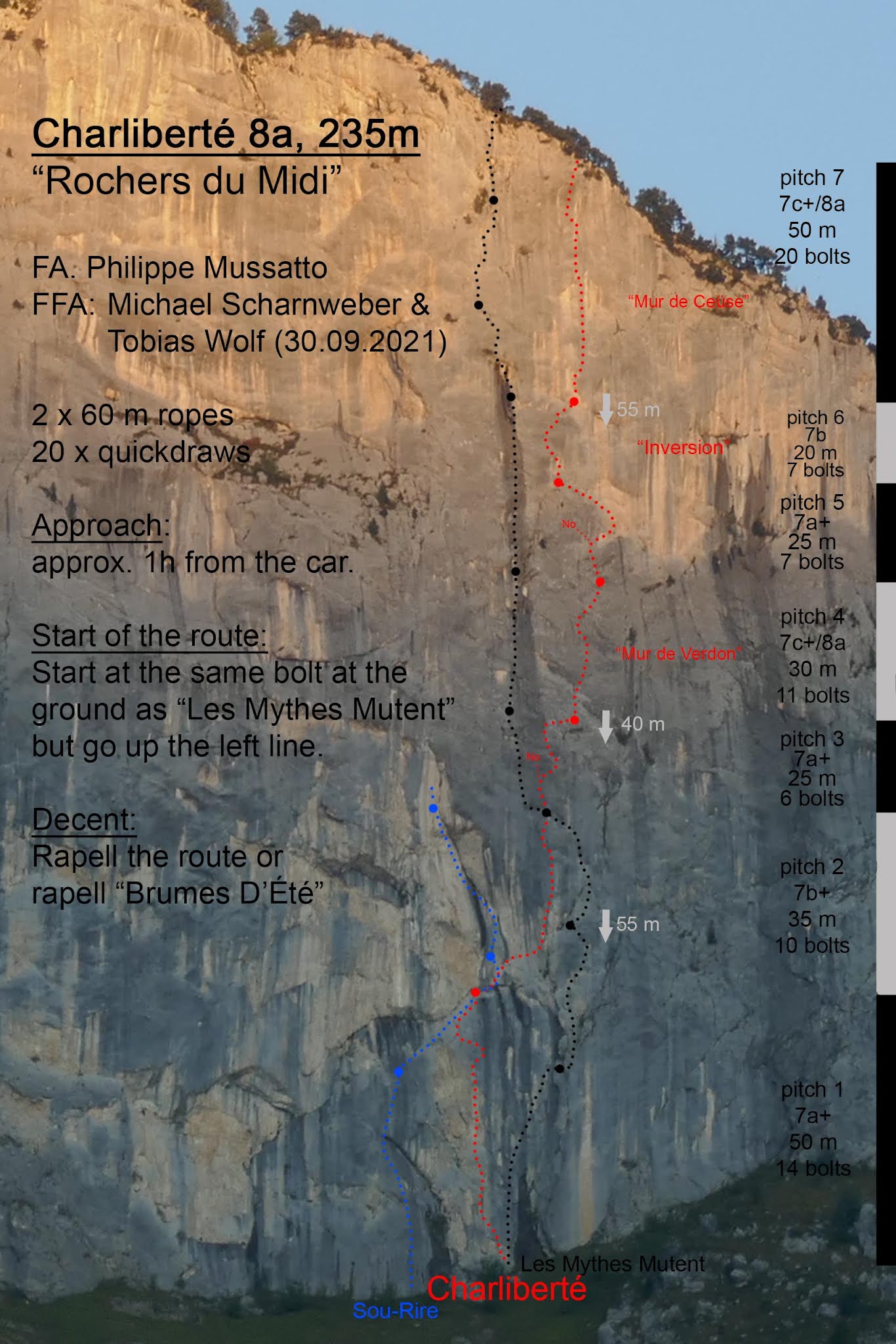 Die beiden Sachsen Michael Scharnweber und Tobias Wolf weilten in Frankreich, um ein unvollendetes, sprich nicht durchgängig freigeklettertes Projekt an der „Rochers du Midi“ von Phillipe Mussatto, einer französischen Kletterikone, zu probieren. Routen wie „Ali Baba“, „Trouterapie“, „Les 40 Voleurs“ und „Carnet d’Adress“ stammen von ihm und sind wahre Meisterwerke. Den beiden gelang die freie Begehung bis auf die 5. Seillänge, die sich einer freien Begehung widersetzte. Nach einem Ruhetag reifte der Gedanke, diese Stelle über ein freizukletternde Variante zu umgehen. Dadurch konnte das Projekt schliesslich gelingen. Da der Name bereits festgelegt war, machten sich die beiden den Spaß, die Route in Anlehnung an den sächsische Dialekt und Michaels Familiennamen sie „(S)Charliberté“ zu nennen. Mehr unter kayakandclimb.blogspot.com.