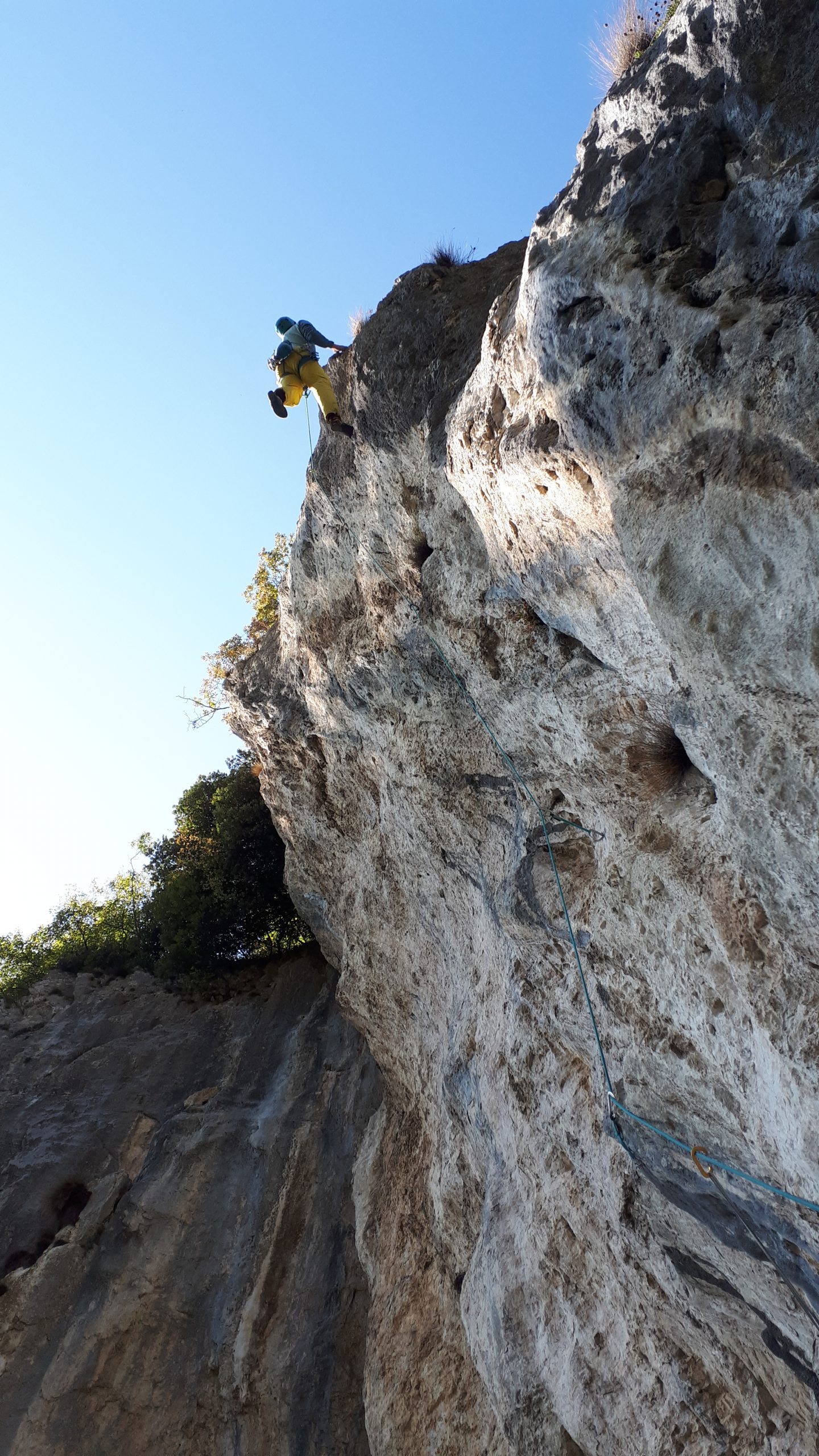 „Endlich haben wir es, nach genau einem Jahr, geschafft, dieses schöne Projekt zu beenden. Nachdem es dieses Jahr nicht so gut mit der Bohrmaschine gelaufen ist, wird jetzt nämlich auch im Alpinen Raum eng mit Neuland, wollten wir gleich am ersten Tag ins Projekt. Wir hatten bissl Zweifel ob wir für genug sind, um es zu Durchsteigen. Aber die erste Hürde war überhaupt hin zu kommen. Die Zufahrtsstraße war wegen eines Radrennens gesperrt und auch durch die Weinberge gab es kein rankommen. Darum müssten wir spontan ein neues Ziel suchen. Und immer mit offenen Augen für neue Linien aber auch da, das gleiche Phänomen wie letztes Jahr, alles schon besetzt oder zu abschreckend. Am nächsten Tag war die Zufahrt frei und wir konnten einsteigen. Die 1. SL wartet mit einer Boulderstelle ganz oben auf. Die 2. Ist ein Traum mit perfektem Gestein und sogar Sinter. Aber die Krönung kommt zum Schluß. Mit einem sehr steilen Start, geht’s auf eine kurze Platte um dann noch mal mit einer technischen Wandkletterei zum Top zu gelangen. Eine wirklich schöne Route in einem stillen abgelegenen Tal.“