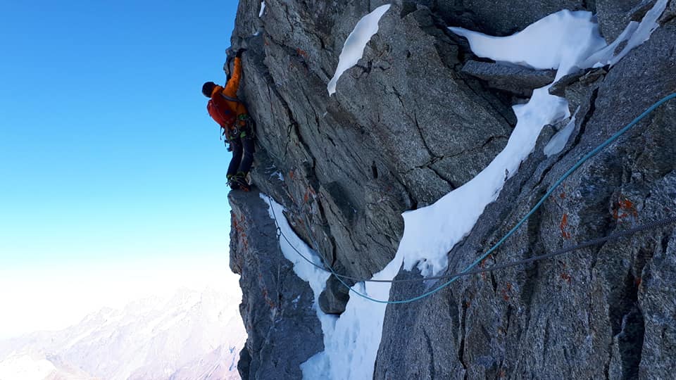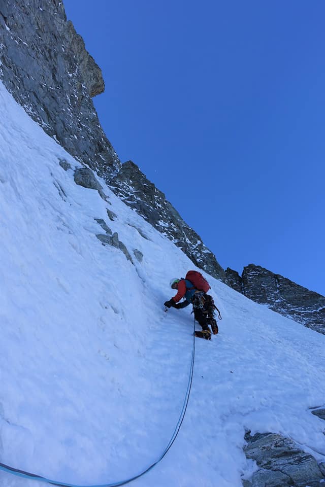 • direkt von der höchsten Firnzunge in Fallinie der Zmuttnase einen zwar kurzen, aber offensichtlich steilen Weg durch den Aufschwung zum ersten Eisfeld zu nehmen: 2 heikle SL M6 und M5, 1H. 100m weiter links wäre zwar länger (inklusive ein leicht absteigenden Querung zum Eisfeld), aber von oben betrachtet wohl deutlich einfacher und auch schneller gegangen. S. M. und M. S. sind an der gleichen Stelle über’n Bergschrund, die erste Länge wohl von rechts her gegangen – vermutlich etwas einfacher. Bei der Gelegenheit: Danke für die Spur – hat sicher nicht geschadet. Eine Seilschaft Italiener war zu dieser späten Stunde (ca. 9:00) links von uns am Werk: Die sind über wohl „Piola“ oder „Gogna“ zum Quergang der Engel“ zugestiegen. Haben allerdings tief und fest geschlafen, als wir auf der Solvay ankamen und immer noch, als wir den Abstieg antraten – ich kann also nicht sagen, ob das viel besser war. Und im Mai wurde irgendwo dazwischen eingestiegen… Ist ein freies Land ;-).