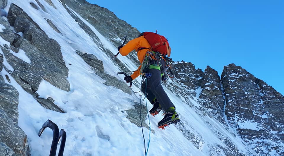 • zu glauben, mit Erreichen der Schmid wärs vorbei. Ja klar, es wird deutlich leichter, dazu die Begehungspuren der ganzen Hundertschaften (Tritte, Hooks, Spur). Aber: es ist noch weit…bis zum Zmuttgrat, und dann immer noch.