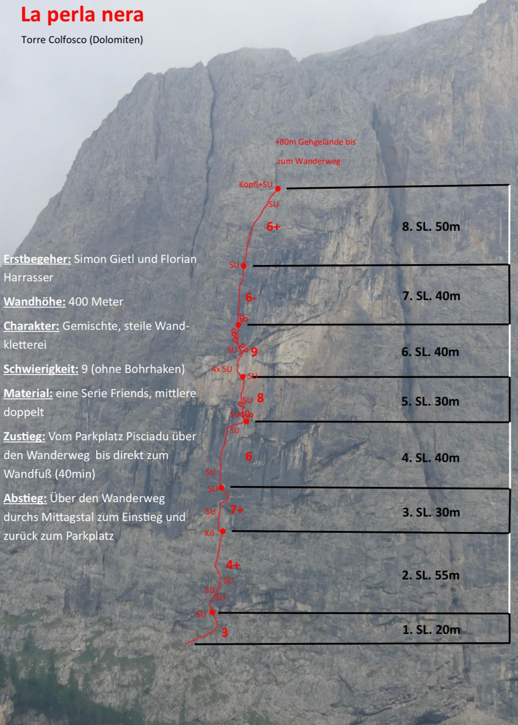 Sonntag, 22. Mai 2022, ich bekam einen Anruf von Simon, nach kurzem Plaudern und ein bisschen Scherzen, erzählte er mir von einer neuen Linie. Als er von einem Klettersteig nach Hause gefahren ist, sah er aufgrund der günstigen Lichteinstrahlung eine neue Linie am Crep de Boe, neben der Tour „Scharfe Helene“ die er zusammen mit Mark Oberlechner erschlossen hat. Es dauerte nicht lange und nachdem er mir ein Wandfoto schickte, trafen wir uns am 26. Mai und fuhren gemeinsam nach Alta Badia. Da Simon bereits den Zustieg kannte waren wir schnell beim Einstieg und nach einer kurzen Diskussion über die Linie waren wir uns einig und stiegen ein. Souverän und schnell kamen wir weiter, da Simon alle Seillängen onsight eröffnete. Nach einigen Seillängen kamen wir zur vermutlichen Schlüsselseillänge, aber nichtsdestotrotz konnte Simon auch diese onsight eröffnen. 370 Klettermetern und acht Seillängen bis zu 8(-) waren es bis wir das Ende der neuen Linie namens „Halli Galli“ erreichten. Das Wetter war nicht ganz so stabil und wir beeilten uns abzuseilen, ich sah am Gipfel während Simon bereits beim Abseilen war noch zur Wand nebenan hinüber und machte ein Foto davon, wie sich herausstellte hatte auch Simon diese Wand im Visier. Keine zwei Tage später haben wir wieder miteinander telefoniert und standen am 28. Mai voll bepackt am Wandfuß, dieses Mal aber an der Wand daneben, nämlich am Torre Colfosco. Da Simon seine Hausaufgaben erledigt hatte wussten wir bereits, dass die Linie schon probiert wurde, wir bekamen jedoch das okay die Linie zu vollenden. Wir suchten nach bereits vorhandenen Haken oder Schlingen, haben aber nichts gefunden und haben uns dann unsere eigene Linie gesucht. Die ersten Längen führen in leichtem Geländen über feinsten, kompakten, schwarzen Felsen hinauf bis man zu einem Dach kommt, bereits zu diesem Zeitpunkt war uns klar, dass diese Tour mit Sicherheit eine Perle der Dolomiten ist. Voller Motivation stieg Simon in die nächste Seillänge ein, ein gut strukturiertes, steiles Dach. Simon erkannte schnell die Schwachstellen davon und war nach kurzer Zeit beim nächsten Stand. Kurzer Blick nach oben, und uns beiden war bewusst, dass der schwierigste Teil noch vor uns ist. Voller Motivation ging es ins nächste Dach hinein. Es hat uns mehr Kraft gekostet als gedacht und wir mussten spät am Abend umdrehen, eine Woche später konnten wir die Tour zu Ende bringen und Simon konnte alle Seillängen Rotpunkt klettern. Den Namen zu finden war nicht schwierig, geprägt von der Schönheit und Beschaffenheit des Felsens wurde die Neutour mit „La perla nera“ benannt. Jetzt warten zwei neue Touren mit einzigartigem Felsen und alpinen Style auf die ersten Wiederholer, viel Spaß!!