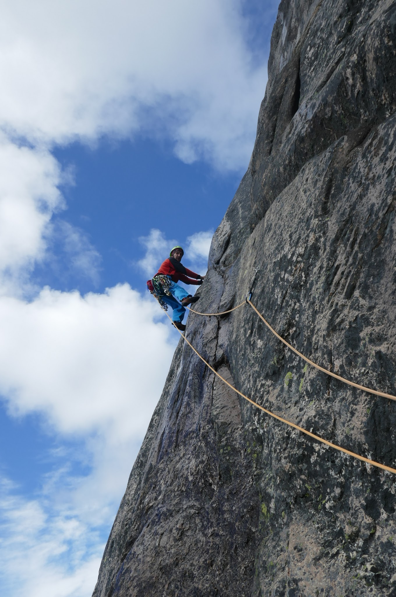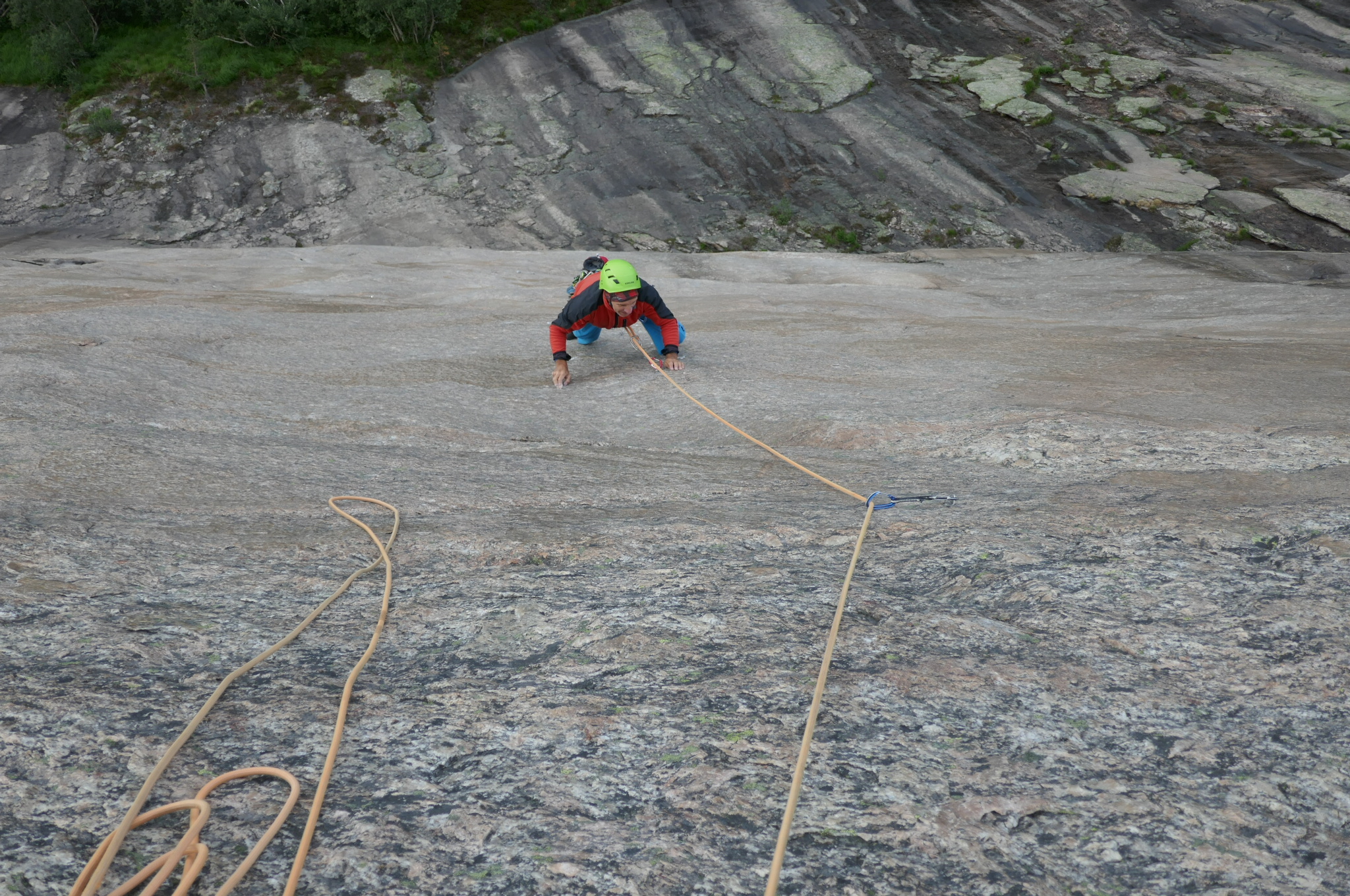 Wir haben unsere Erstbegehung so genannt, weil wir genauso wie die Wikinger auf der Suche nach Neuland waren. Wir sind im „Felsozean“ unterwegs einem neuen Weg zum Gipfel zu finden. Die Wikinger hofften jenseits des Atlantiks auf ein exotisches Land zu stoßen (bei ihnen wuchs Wein, deswegen Vinland). Wir hatten nicht erwartet, in Norwegen auf Granit mit ähnlicher Qualität, wie im Yosemite zu stoßen. Dazu kommt, dass der Route schon eine längere Vorgeschichte hat. Er wurde 2007 von Ralf Reißig & Dieter Ulbrich begonnen. 2011 probierte er mit Katja Reißig erneut. Schlechtes Wetter und ein Sturm hatte sie vertrieben und seitdem hat das Projekt über Jahre hinweg im Dornröschenschlaf geschlummert. Den Elbsandsteinkletterern unter den Lesern sollte dieser Name bekannt vorkommen, gehen doch über 100 Erstbegehungen und etliche 10er in Sachsen auf Ralfs Konto. Auch in Norwegen war er sehr aktiv und nicht weniger als 7 Routen am Hægefjell und weitere im Nissedal gehen auf das Konto von ihm und seinen Kletterpartnern.