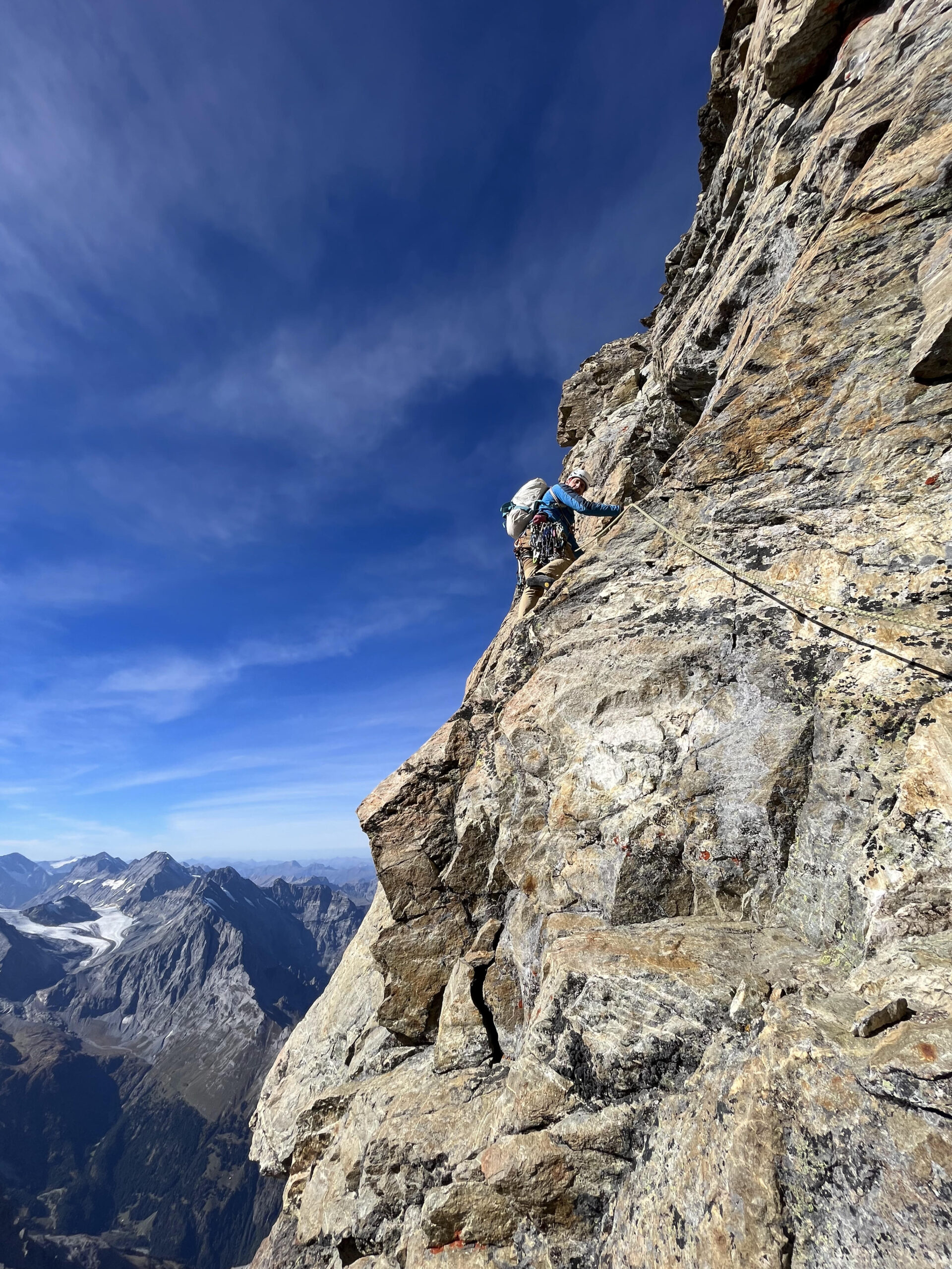 Mit dem ersten Tageslicht erreichen wir die graue Steilstufe, wo der Fels von Gneis zu Kalk wechselt. Zwei steile und anspruchsvolle Seillängen im Bereich 6b führen uns auf den grossen Pfeiler, welcher imposant auf das Gipfeldach führt. Von hier geht es wieder im Gneis weiter. Eine eindeutige Linie gibt es auch an diesem Pfeiler nicht. Wir folgen unsere Nase und wählen im Zweifelsfall die anspruchvollere Variante mit besserem Fels. Schneller als erwartet erreichen wir am frühen Nachmittag den Gipfel und gute 11 Stunden nach Aufbruch sind wir auf dem Jungfraujoch. Was für ein Kontrast, als wir nach der Ruhe und wilden Schönheit des Rottals umgeben von Werbebildschirmen und Selfiesticks zur Bahnstation gehen. Trotzdem sind wir