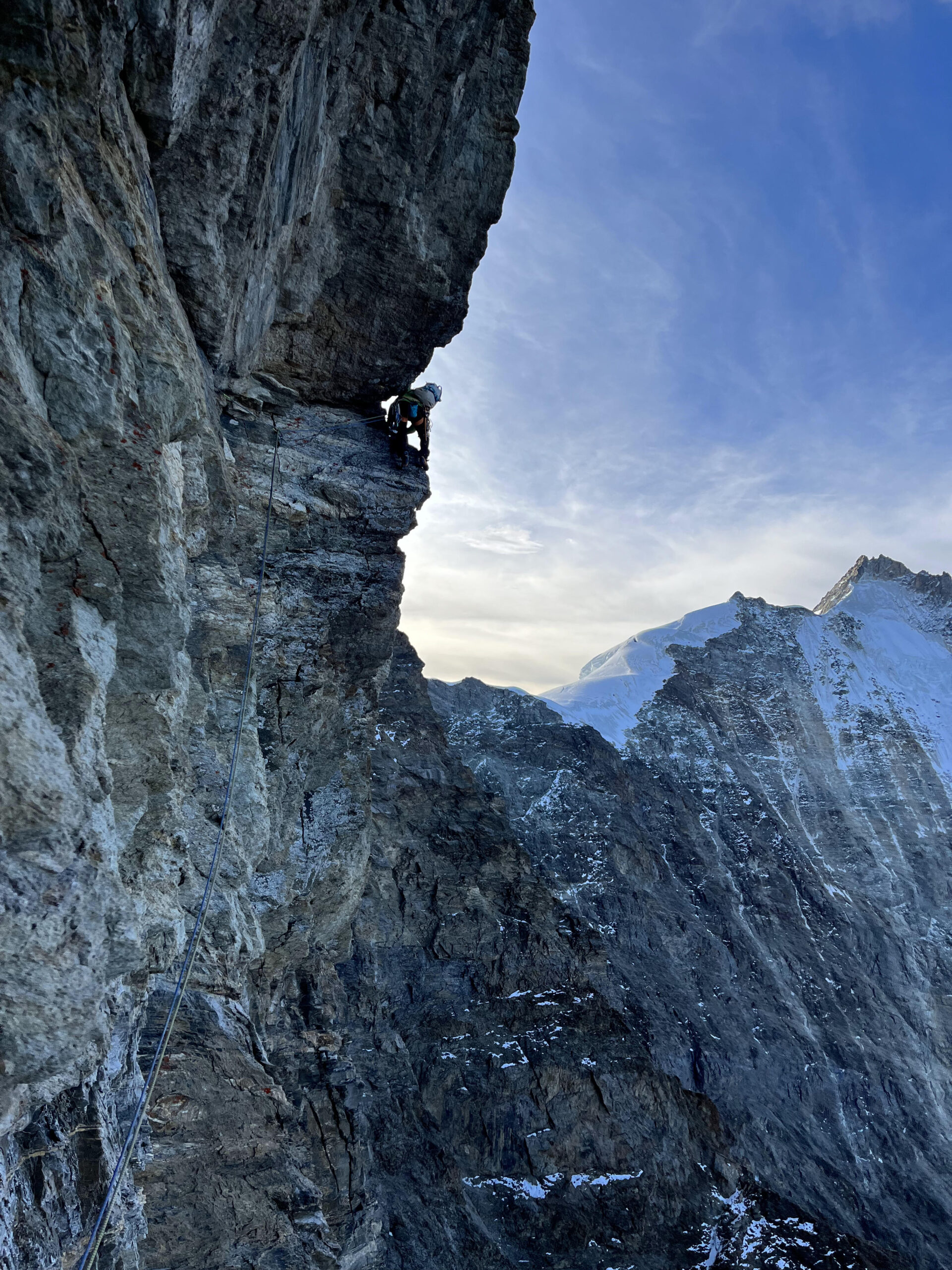 Mit Peter von Känel und Rolf Zurbrügg habe ich die perfekten Partner für diese Unternehmung an meiner Seite. Am 11. Oktober steigen wir zur Rottalhütte auf und am nächsten Tag geht steigen wir ein. Die ersten drei Stunden klettern wir im Licht der Stirnlampen auf dem Pfeilersystem im unteren Wandteil. Wir folgen keiner spezifischen Linie, die Schwierigkeiten sind – bis auf zwei Seillängen im Bereich 6a – im dritten bis fünften Schwierigkeitsgrad.