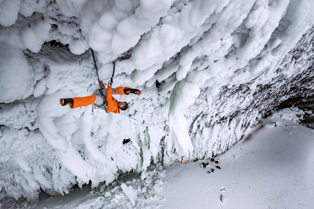 Der Extrembergsteiger und Mammut Pro-Team Athlet Dani Arnold eröffnet im Februar 2018 eine neue Eiskletter-Route in den weltbekannten Helmcken Falls in British Columbia, Kanada. Dani gibt der neuen Route den Namen „Power Shrimps“ – weil die Eiszapfen in dieser Grotte verdreht sind, Stacheln haben und krumm wie Shrimps sind. (PPR/Mammut/Thomas Senf)