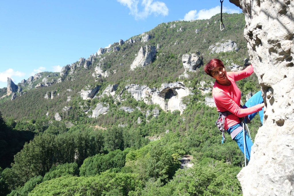 Irmgard Braun of her name Climber and author has made it. She had set herself this year to climb a slick ninth and has been training for it since January 11th. Now the time had come: Irmgard had chosen the route „E.V.N.I“ (7c) in the Dès qu fas aqui sector in the Tarn Gorge.