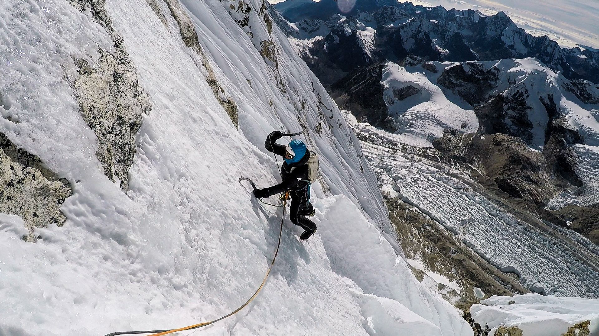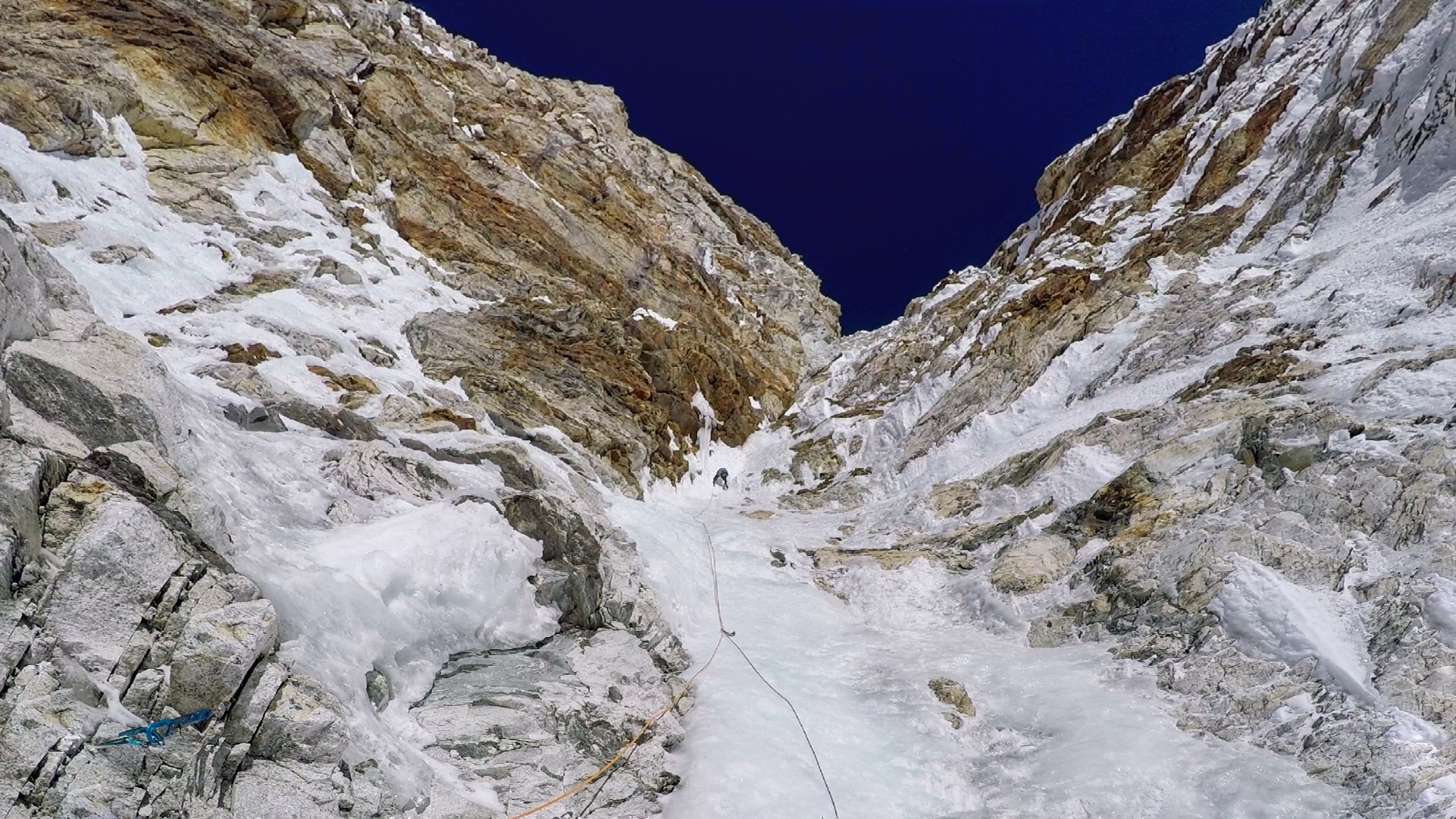 und steigen über senkrechtes Eis und technisch anspruchsvolle Felspassagen. Kurz vor dem Gipfel fordern