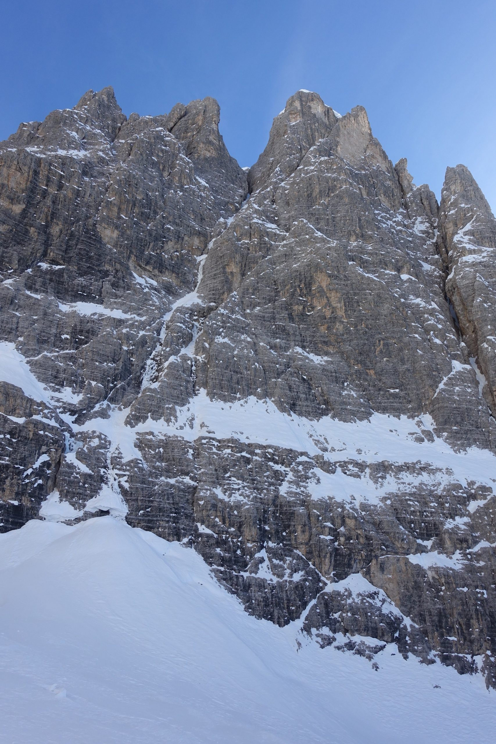 aufsteigen, da man vorher das Couloir nicht sehen kann. Dort angekommen sah ich genügend Eis, um einen Versuch zu wagen. Mit meinem Seilpartner, Hannes Egarter, ebenfalls Bergführer aus Sexten, bin ich am nächsten Morgen gestartet. Bereits gegen Mittag standen wir nach circa 600 Klettermetern im Schnee und Eis auf der Mitria, dem Vorgipfel des Zsigmondykopfes. Das Klettern im Couloir ging wesentlich besser voran als erwartet. Lediglich eine anspruchsvollere