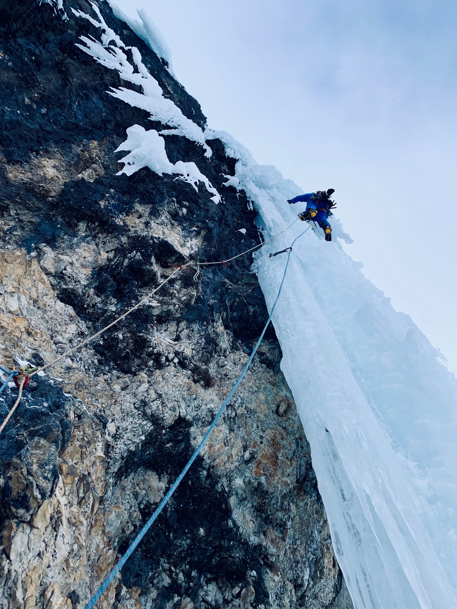 Facts Route: „The White Edition“ First Ascent: Simon Gietl and Daniel Taverini in January 2020 Difficulty: M7, WI5+ 6, (140m) Protection: 6 Pitons for the Stands und 3 Pitons in the route, no anchors. 2 set Friends + ice climbing equipment