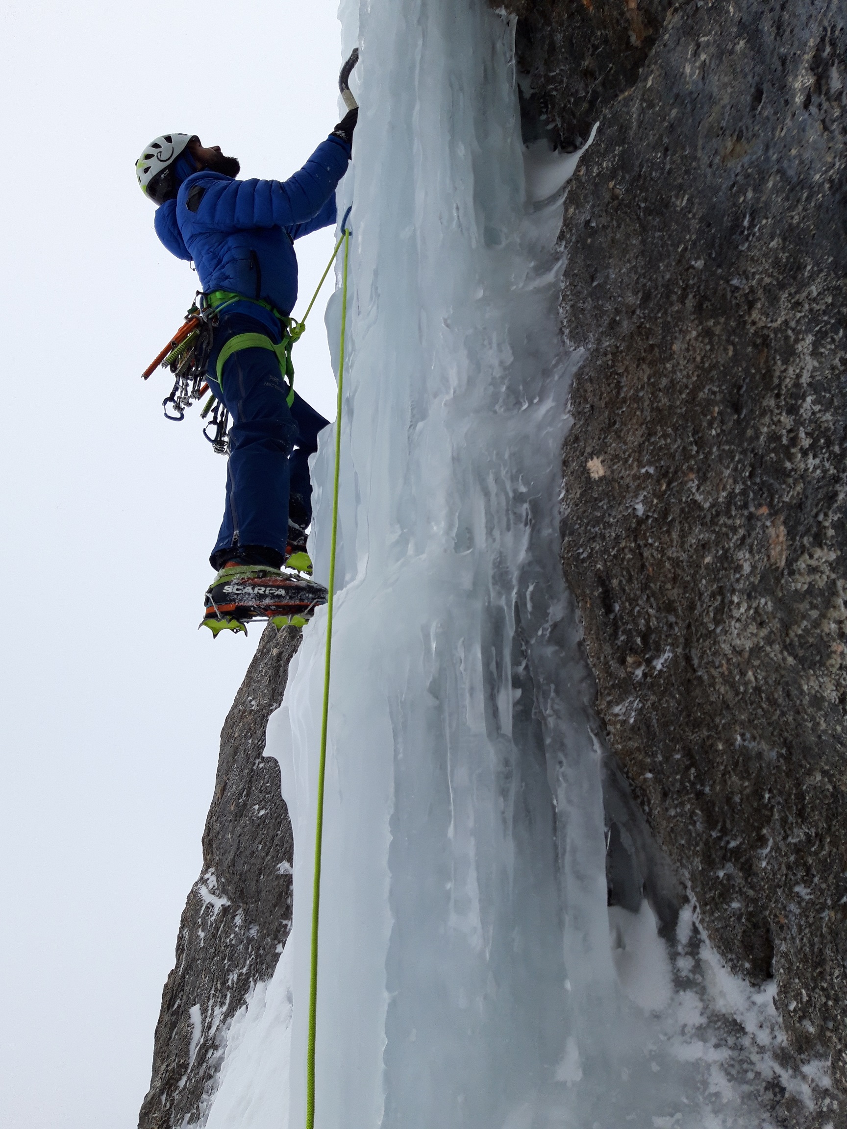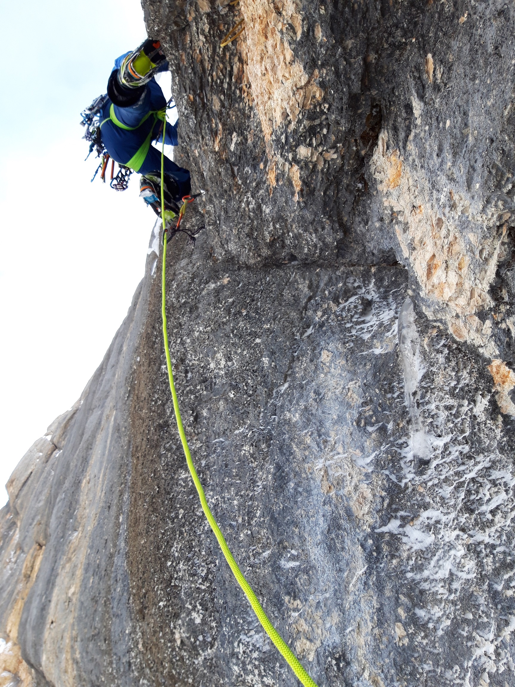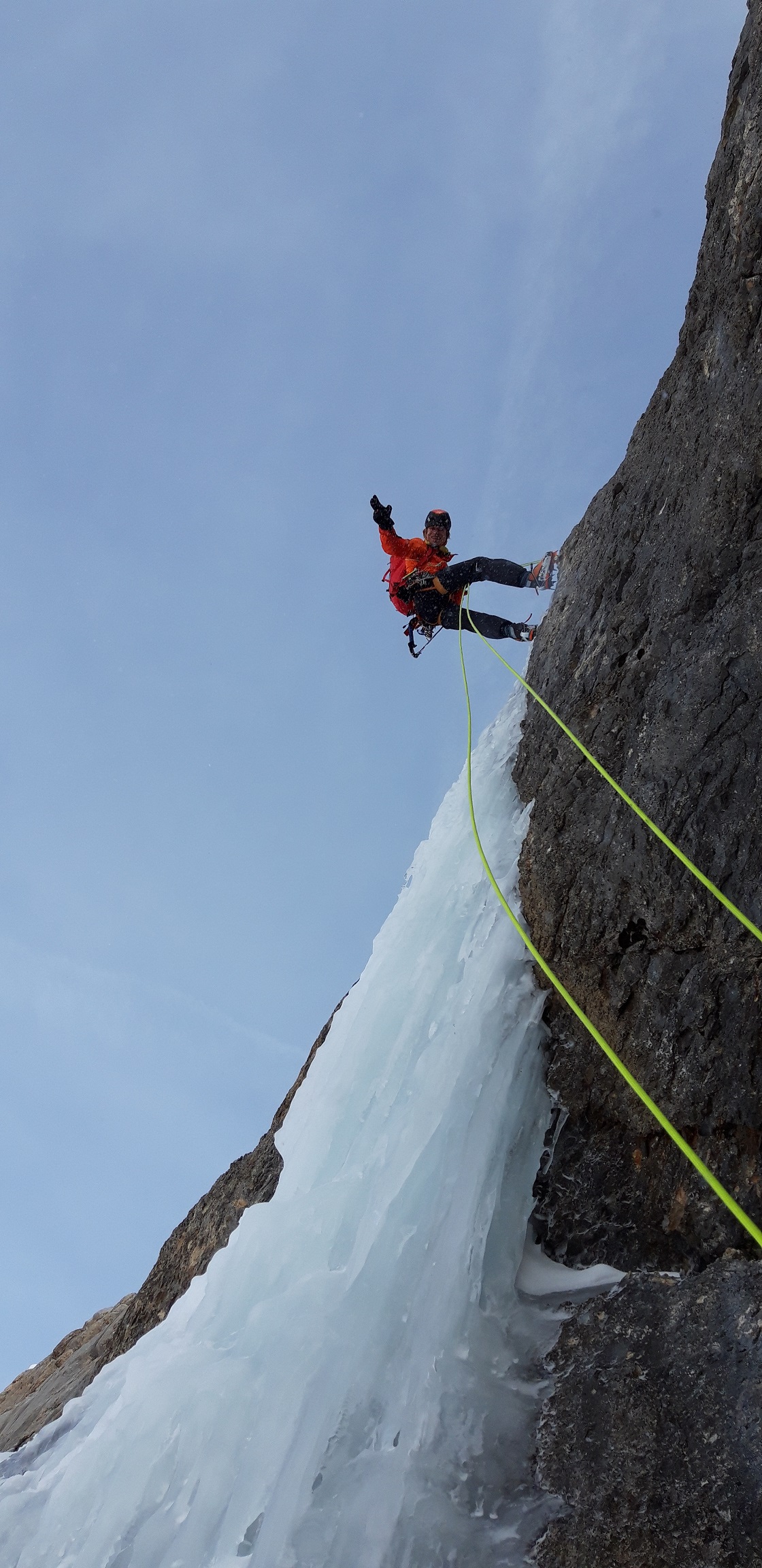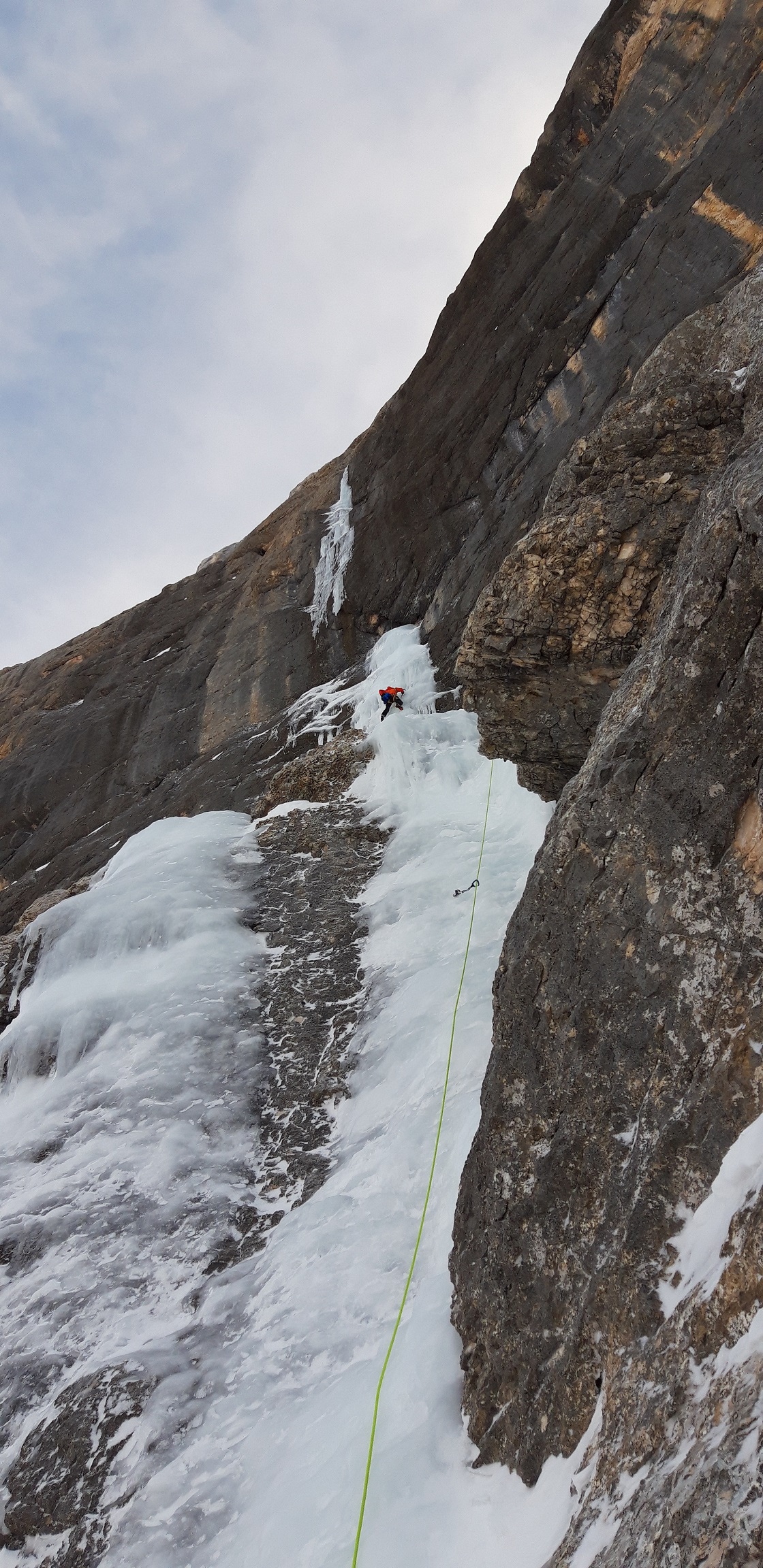 Ich kenne viele lokale Alpinisten (mich mit eingeschlossen) die diese Linie über Jahre hinweg im Auge hatten. Wir waren tatsächlich zur richtigen Zeit am richtigen Ort, denn die dünne Eisglasur trocknet normalerweise sehr früh im Winter aus und ist dann nicht mehr kletterbar.
