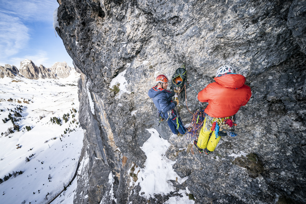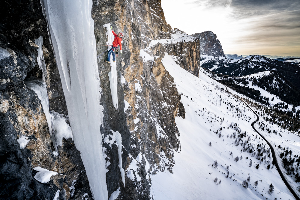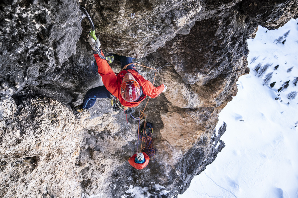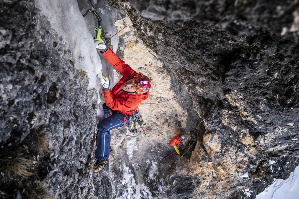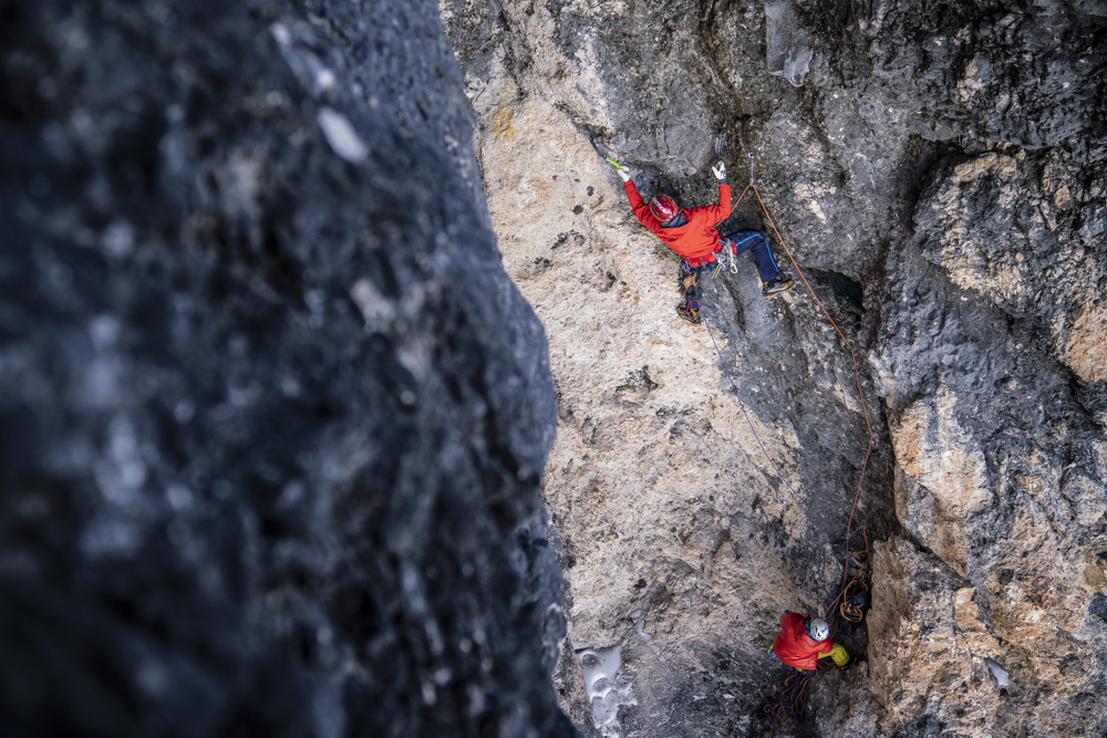 Neben unserer Tätigkeit als Ausbilder bei der Österreichischen Bergführerausbildung hatten wir zwischen Eisfallkurs und Aufnahmeprüfung einen Tag frei. Was macht ein Eiskletterer an so einem freien Tag? Eisklettern natürlich… wir machten uns auf die lange Reise von Matrei in Osttirol zum Grödner Joch und versuchten unser Projekt frei zu klettern. Am Pass angekommen hatte es -12 °C, nicht gerade ideal für das steile Mixedgelände. Doch nach 2,5 Stunden Autofahrt war klar, versuchen mussten wir es. Bereits in der 2. Seillänge, der knackigen M8, konnte ich fühlen, wie uns die Kälte heute fordern würde. Die Bewegungen mussten präzise und flüssig laufen, ansonsten wurde es sofort extrem anstrengend. Doch von der ersten Begehung wussten wir nur wenig Abläufe, wir hatten die Bewegungen nicht einstudiert. Benni punktete recht schnell die 3. Seillänge – nun kam die Schlüsselseillänge, eine überhängende Verschneidung mit Eisglasuren und weiten Zügen. Bis zur Crux lief es überraschend flüssig, doch nun kannte ich die Bewegungen und Placements nicht – beim Einrichten zog ich mich technisch über diese Passage. Nach einigen Anläufen an kleinen Hooks auf dünnen Glasuren fand ich doch noch eine Lösung. Meine Unterarme waren komplett sauer, ich musste aber noch im Eis weiter klettern und selbst die Schrauben platzieren. Zum Glück fiel mir im letzten Moment die Verschneidung im Hintergrund ein, ich stemmte mich mit letzter Kraft mit dem ganzen Körper dagegen, full contact! So konnte ich meine Arme etwas ausruhen, um eine Schraube zu setzen und im steilen Eis bis zum Stand weiter zu klettern. Nach einer leichteren Länge wartet zum Abschluss noch eine obligatorisch zu kletternde M7-Stelle kurz bevor es zum Abschlusszapfen geht. Mit Entschlossenheit kletterte ich fokusiert zum Ende der Route und bald darauf kam Benni mit einem Lachen im Gesicht zum Stand. Geschafft, trotz der Kälte!