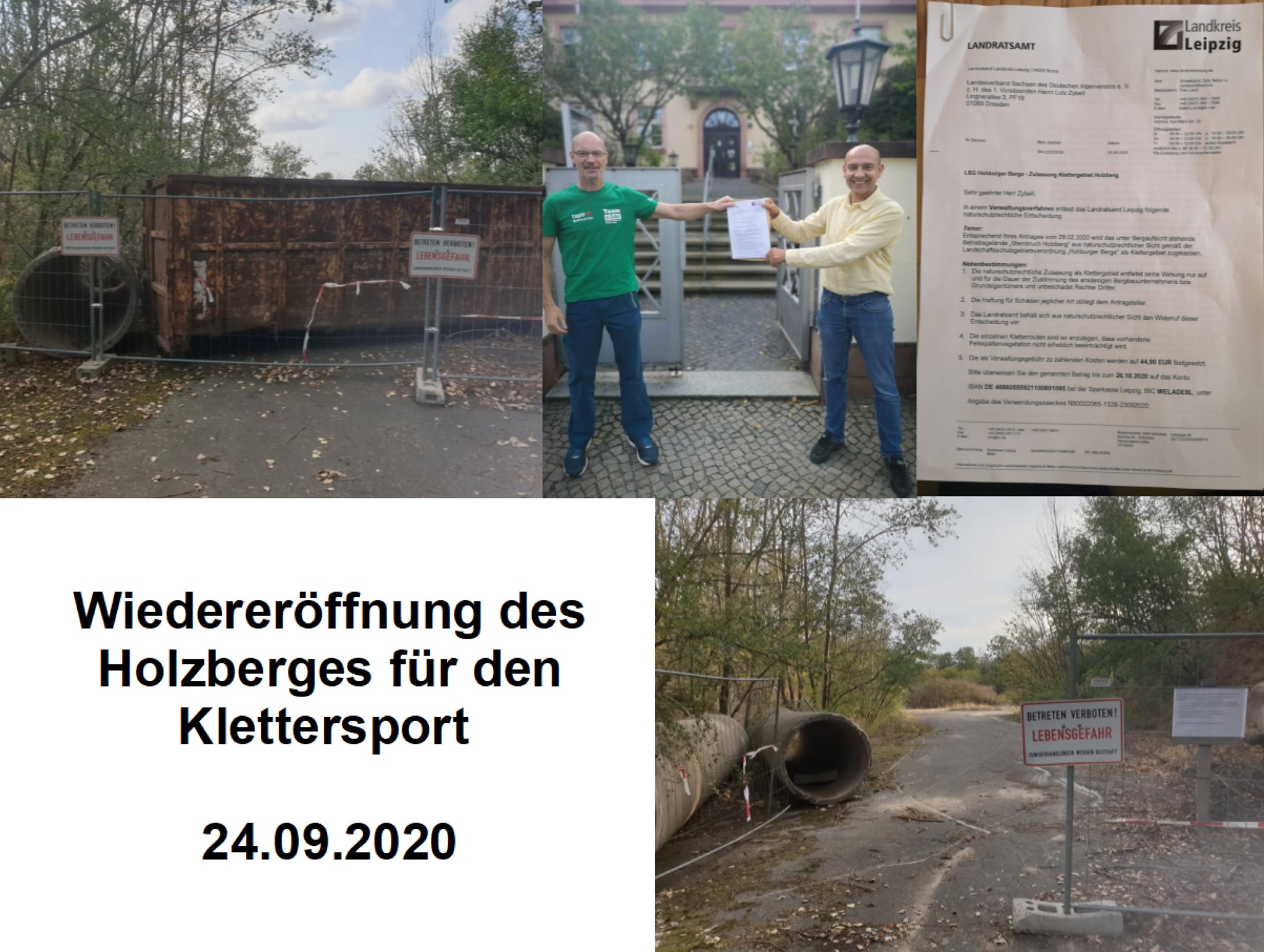 Nunmehr waren intensive Nachverhandlungen erfolgreich, sodass die Genehmigung auch für den Holzberg erteilt werden konnte. Der entsprechende Bescheid wurde heute vom Landkreis Leipzig einem Vertreter des DAV übergeben. Im Gegensatz zum Zinkenberg war für den Holzberg letztlich ausschlaggebend, dass es sich beim Holzberg nicht, wie ursprünglich von den Behörden unterstellt, um einen aktiven Bergbaubetrieb handelt, sondern dass dort der Rohstoffabbau schon jahrzehntelang eingestellt ist.