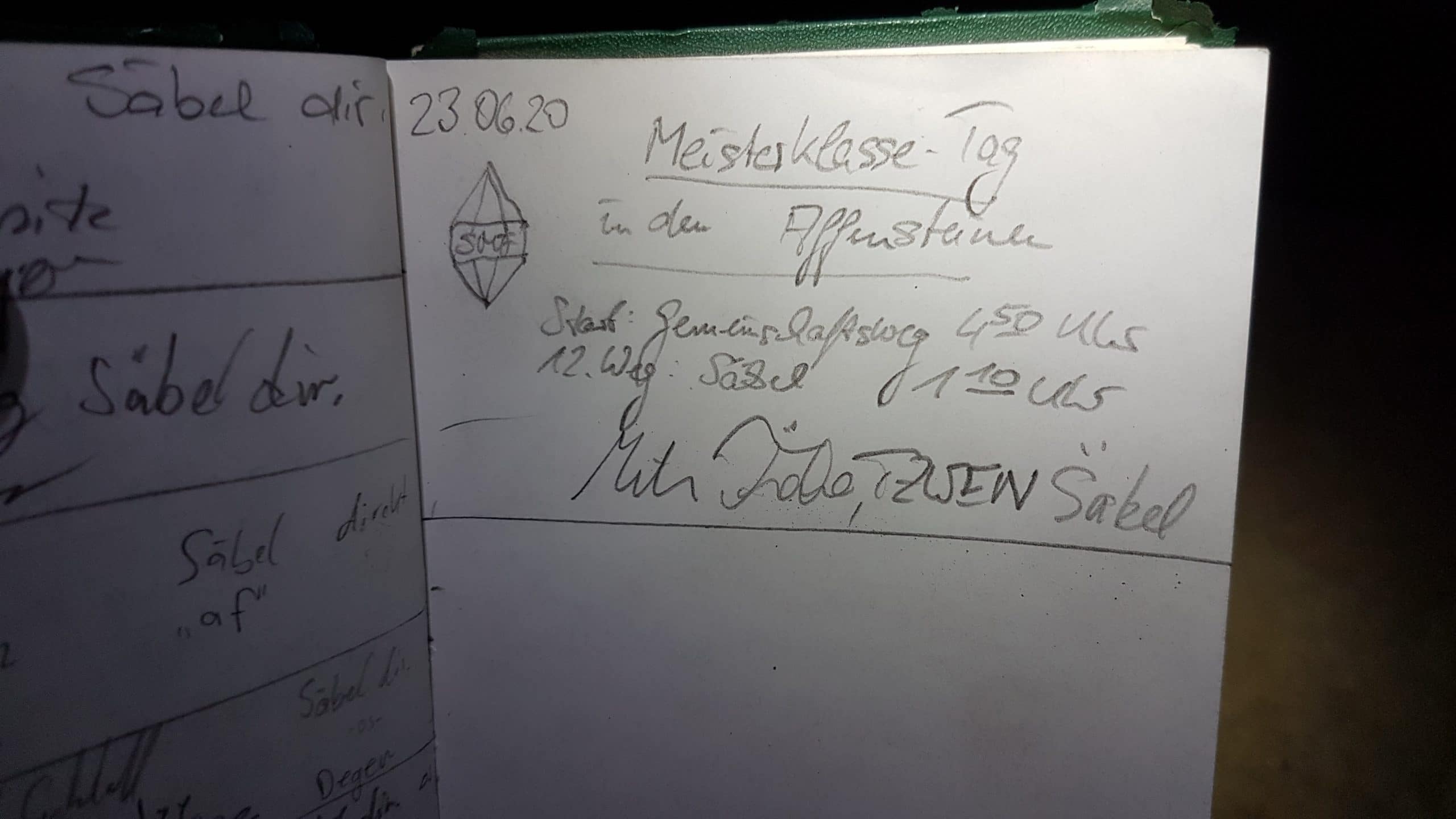 Wieder unten angekommen schoben wir am Wilden Kopf ein kurzes zweites Frühstück ein und bekamen von Goy, der mit seinem Kumpel gerade in den Klettertag startete, noch ein paar Tipps für die Wolfturm SO-Wand, die am Nachmittag bei uns noch auf dem Programm stand. Als nächstes ging es zum Freien Turm, wo wir den Talweg mit Lindnervariante noch im Schatten klettern konnten. Im Gipfelbuch fanden wir eine sehr interessante Eintragung: Svante Neumann, der letztes Jahr mit 16 Jahren seinen letzten Gipfel im Vorstieg bestiegen hatte, sammelt jetzt Meisterwege statt Gipfel. Innerhalb des ersten Halbjahres 2020 hat er von der 1974er-Liste bereits sage und schreibe die Hälfte (also 46 Stück) geklettert – eine unglaubliche Leistung! Vielleicjht ist Svante ja bis Jahresende fertig mit der Liste.