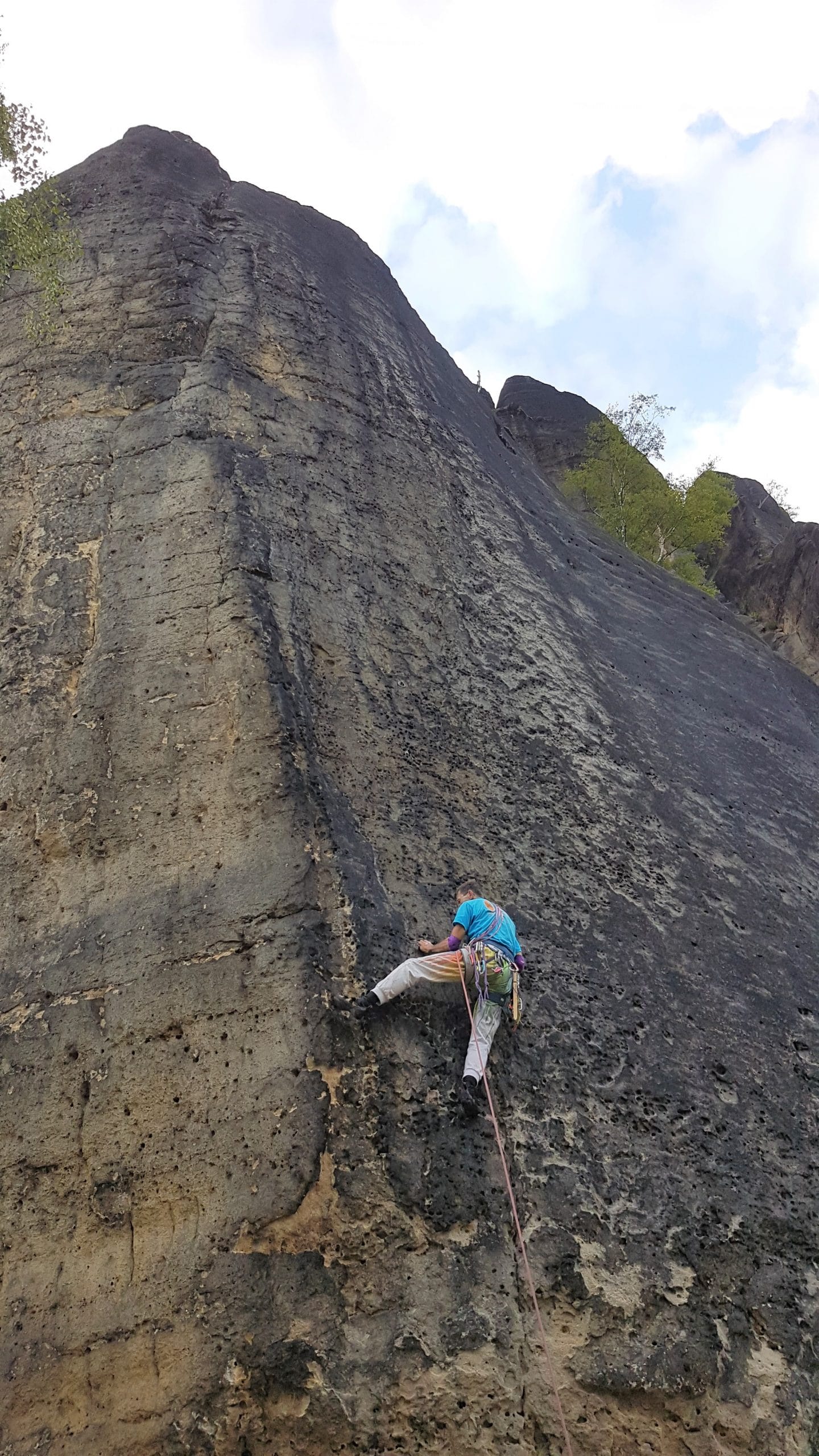 Im Juni 2017 starteten Martin Treiber und ich einen ersten Versuch in den Affensteinen. Bei denkbar schlechten Bedingungen – die nordseitigen Reibungsausstiege waren noch völlig grün und es war außerdem nach einem nächtlichen Gewitter schwülwarm – mussten wir uns nach 9 Wegen geschlagen geben. Unsere grundlegende Taktik – an der Gruppe am Wilden Kopf zu beginnen, sich dann in Richtung Bloßstock vorzuarbeiten und zum Abschluss noch in den Kleinen Dom zu wandern um den Säbel zu klettern – schien aber nicht verkehrt zu sein. Einige Wochen später versuchten Tino Tanneberger und Peter John ihr Glück mit einer anderen Taktik. Nachdem sie früh alle Meisterwege im Dom – auch die nominell schwere Süd- und Nordwand der Rohnspitze – abgehakt hatten, setzen sie die Runde am Gemeinschaftsweg fort. Bei Weg Nr. 10 mussten sie jedoch abbrechen, da Peter Krämpfe in den oberen Extremitäten bekam, die ein Weiterklettern unmöglich machten.