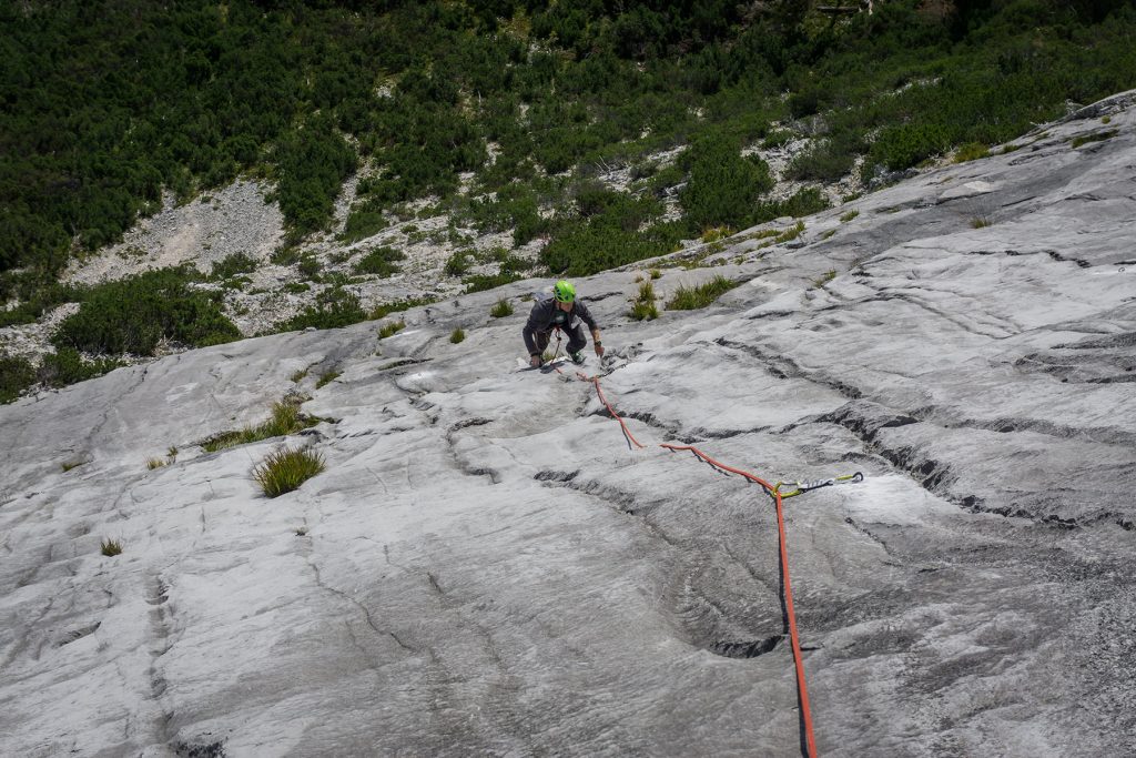 Vom Peter Manhartsberger gibt es wieder was Neues. Zusammen mit Stephan Weckschmied konnter er an der Südwand des Unteren Spitzhüttenkopfs „Im Verbrennten“ im Karwendel vier neue Genußtouren im perfekten Fels einrichten. Die Wand bietet unglaublich kompakte Kletterei entlang von Wasserrillen. Da kommt Sonnenplattenfeeling auf.