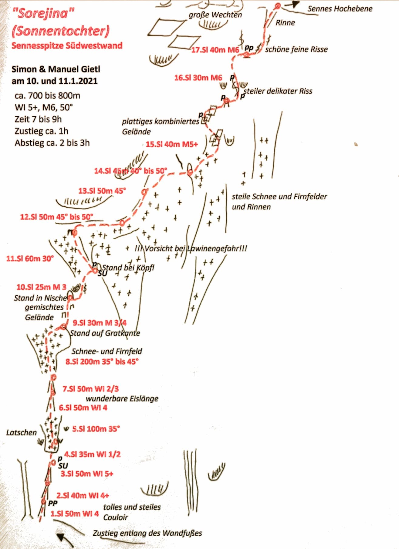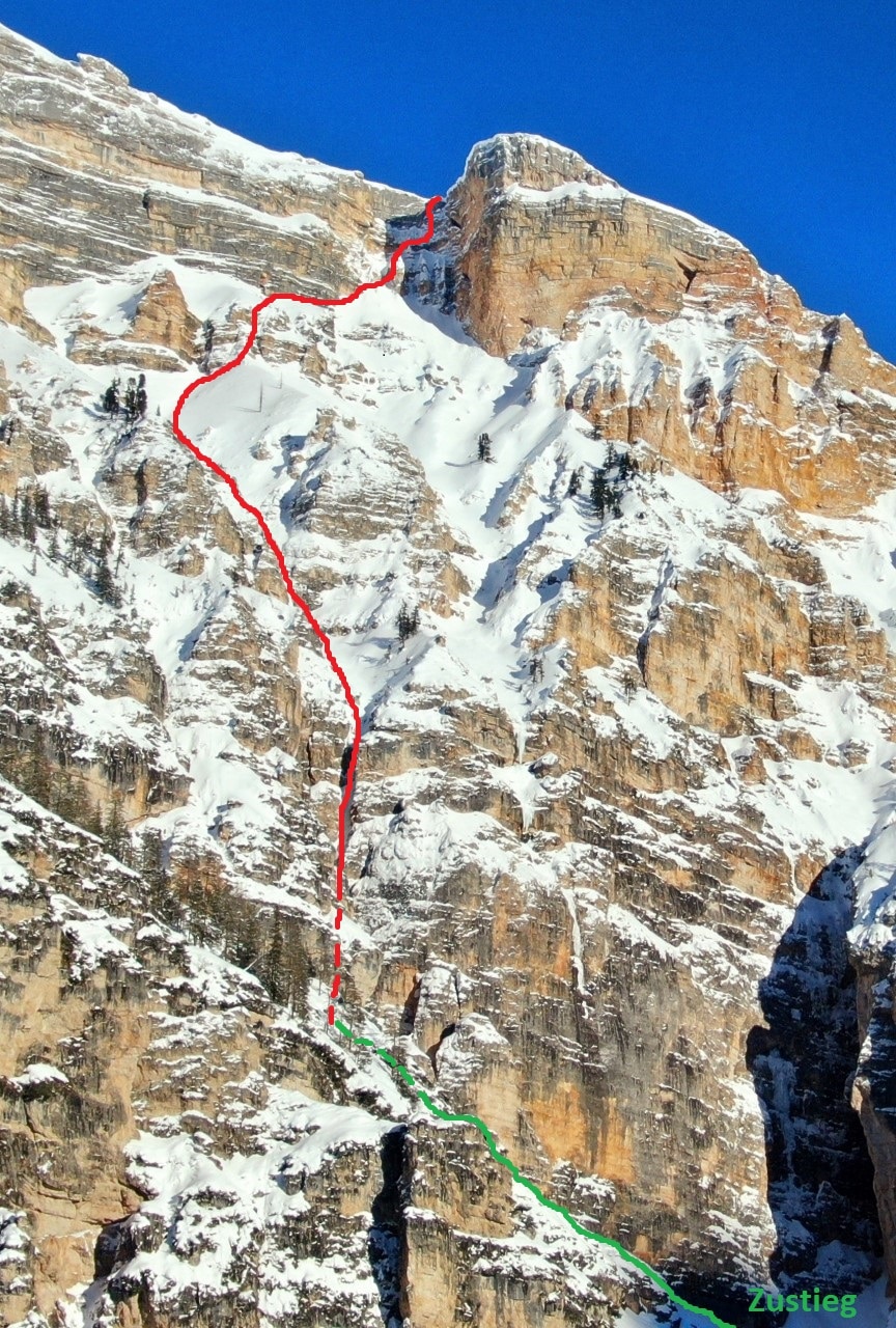 Eigentlich wollten sich die zwei Südtiroler Brüder Simon und Manuel Gietl nur einen steilen Kamin, den Manuel vor einigen Jahren bei einer Erstbegehung einer alpinen Sportkletterroute erblickte, genauer begutachten. Dieser war damals noch im April mit großen imposanten Eiszapfen bestückt. Doch Simon und Manuel wurden am 10.1. enttäuscht. Kaum Eis und links davon gab es nur eine extrem dünne Eisauflage. Nun musste ein Plan B her. Simon entdeckte knappe hundert Höhenmeter weiter westlich ein steiles eisiges Couloir. Dieser Plan B sollte uns mehr als entschädigen. Wir entschieden uns einzusteigen und einfach „mal zu schauen“. Die Kletterei gestaltete sich anspruchsvoll aber sehr genussreich. In der dritten Länge erwartete sie eine steile ziemlich heikle Eislänge, die je nach Eisbeschaffenheit sicherlich nicht zu unterschätzen ist. Nach knappen 150 Metern sanken die Schwierigkeiten. Nach anstrengendem Gestapfe im steilen Schneefeld kletterten sie immer logisch einen steilen Eisschlauch hoch. Dieser bot sehr genussvolle Eiskletterei. Doch sollte beachtet werden, dass diese Eislängen bereits zur Mittagszeit Sonne bekommen und ihre Konsistenz darunter stark leidet. Von dort seilten sich die zwei vorerst zurück zum Wandfuß und entschieden sich am nächsten Tag zu sehr frühen Stunde zurückzukehren und die gesamte Wand „durchzudrücken“.