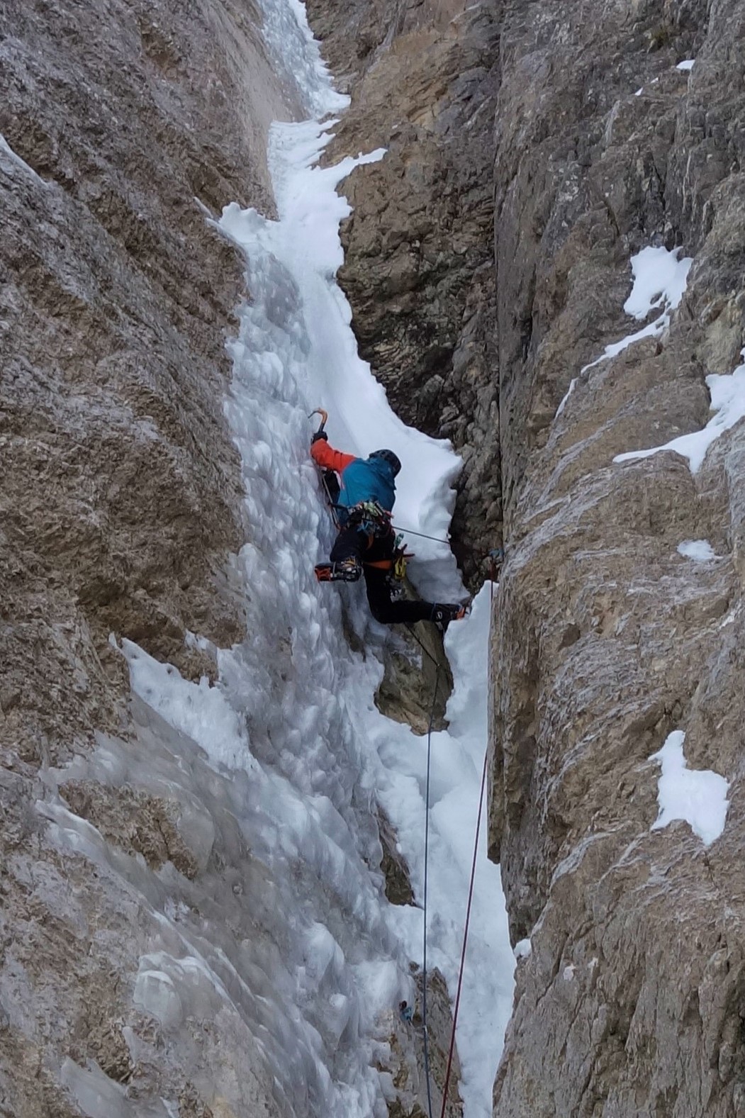 Um kurz vor halb 9 startet David in die Eisspur im Vorbau. Wie üblich ohne Seil und wie üblich unter meinem Protest ob der, laut David „herunterfallenden Wattebäusche“. Irgendwann binden wir uns ein und David wühlt los. Schnell wird klar, was hier heute Sache sein wird. Kein genüsslich-steiles Eisklettern. Viel mehr ein imposanter Eindruck, wie unglaublich steil man Schnee locker Stapeln kann. Aber die Würfel sind gefallen, ich habe noch am Einstieg den Wunsch geäußert die wohl steilste und schwierigste 5. Seillänge zu führen. Und das durfte ich dann. Es fällt mir immer noch schwer die Schwierigkeiten dieser Länge in Worte zu fassen.
