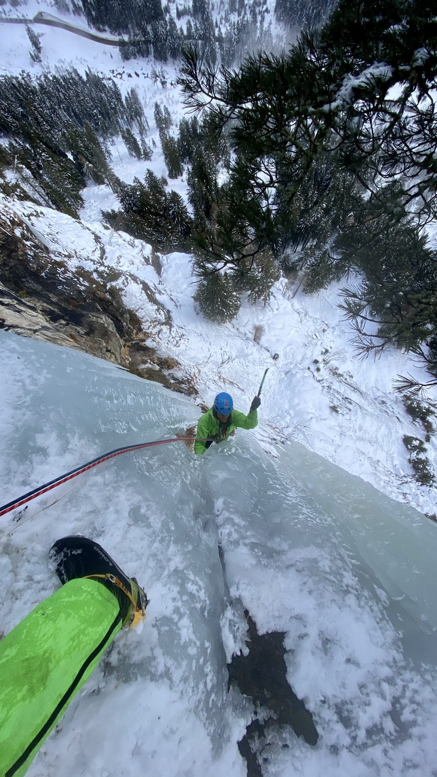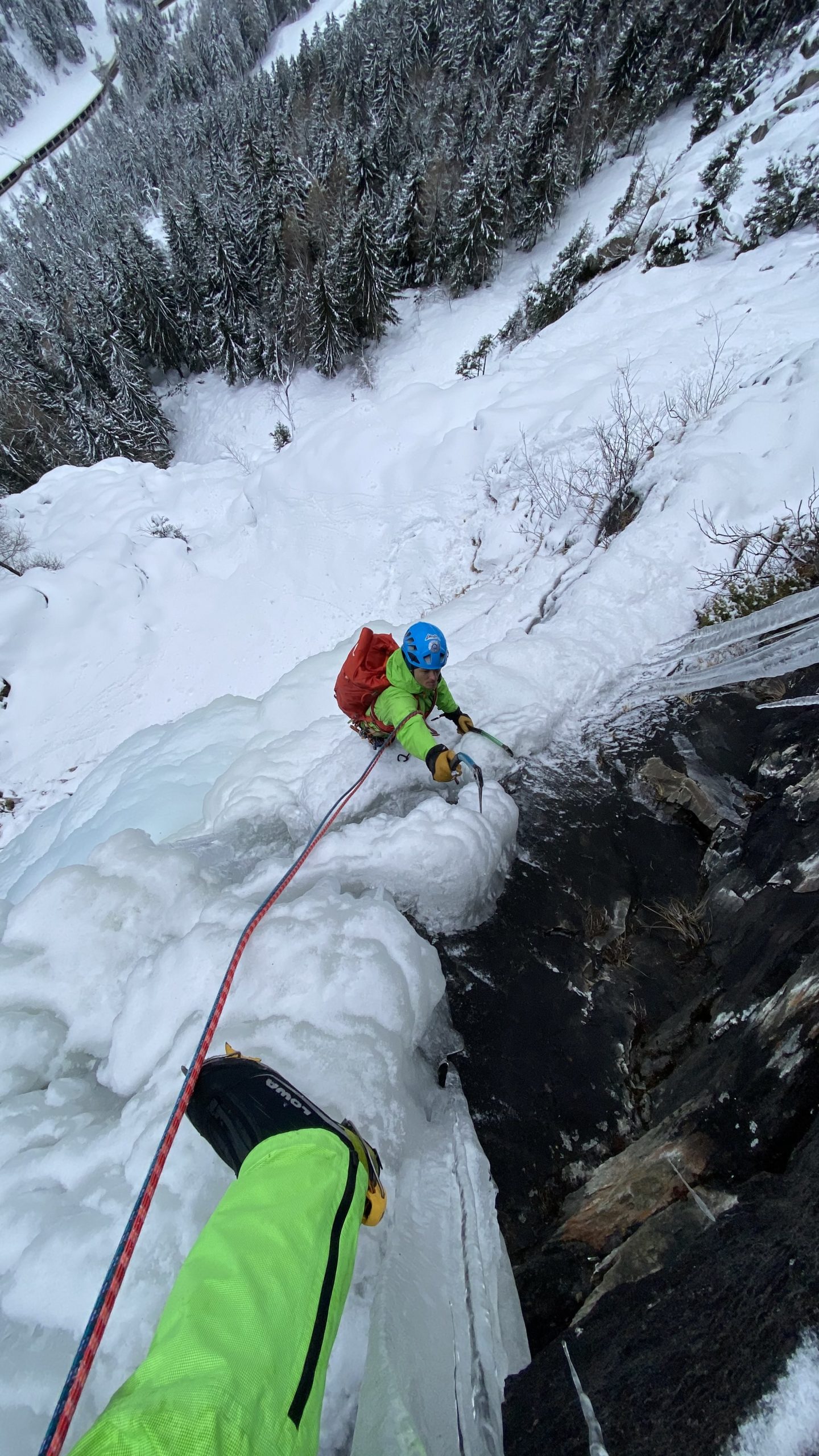 Doch Ende Januar 2021 sollte es nun endlich soweit sein. Der Verlauf des heurigen Winters und die Temperaturen boten optimale Verhältnisse. Der Zapfen hatte die richtigen äußeren Bedingungen, um schlussendlich optimal zu wachsen. Bereits Mitte Dezember wollte ich die Route versuchen. Doch einige klare und sonnige Tage vereitelten dieses Vorhaben. Der steile Zapfen brach ein Erstes Mal ab. Da die Linie südseitig ausgerichtet ist, ist der Ausstiegszapfen um die Mittagszeit erbarmungslos dem Sonnenlicht ausgesetzt. Ich hoffte auf die passenden Wetterprognosen. Diese sollten nun Ende Januar eintreten. Bewölkt, kalt und höchstwahrscheinlich keinen einzigen Sonnenstrahl – für das Vorhaben, die Route erstmals ernsthaft zu probieren ideale Bedingungen. Der Eisvorhang war wieder nachgewachsen und erschien genügend stabil zu ein. Mit meinem Bergführer Kollegen Mark Oberlechner fand ich einen ebenso motivierten Partner. Am Freitag, 29. Januar konnten wir die neue Route schließlich verwirklichen.