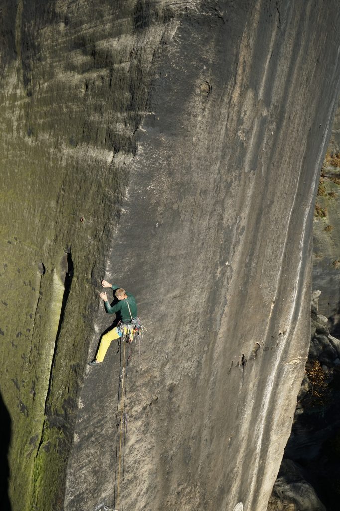 Schon im November letzten Jahres konnte das alte umstrittene Projekt am Jäckelfels nun von Chris-Jan Stiller als „Kingline“ (a.f.) erstbegangen werden. Rechts der berühmten Bernd Arnold-Route „Lohn der Angst“ (IXc) zieht auf der anderen Seite der markanten Kante, die Route durch die Talseite an 10 Ösen vorbei zum Gipfel. Chris-Jan Stiller und Tino Tanneberger konnten nun die Route weiterführen und letztlich Beenden. Mittlerweile hat der Weg schon über zehn Begehungen.