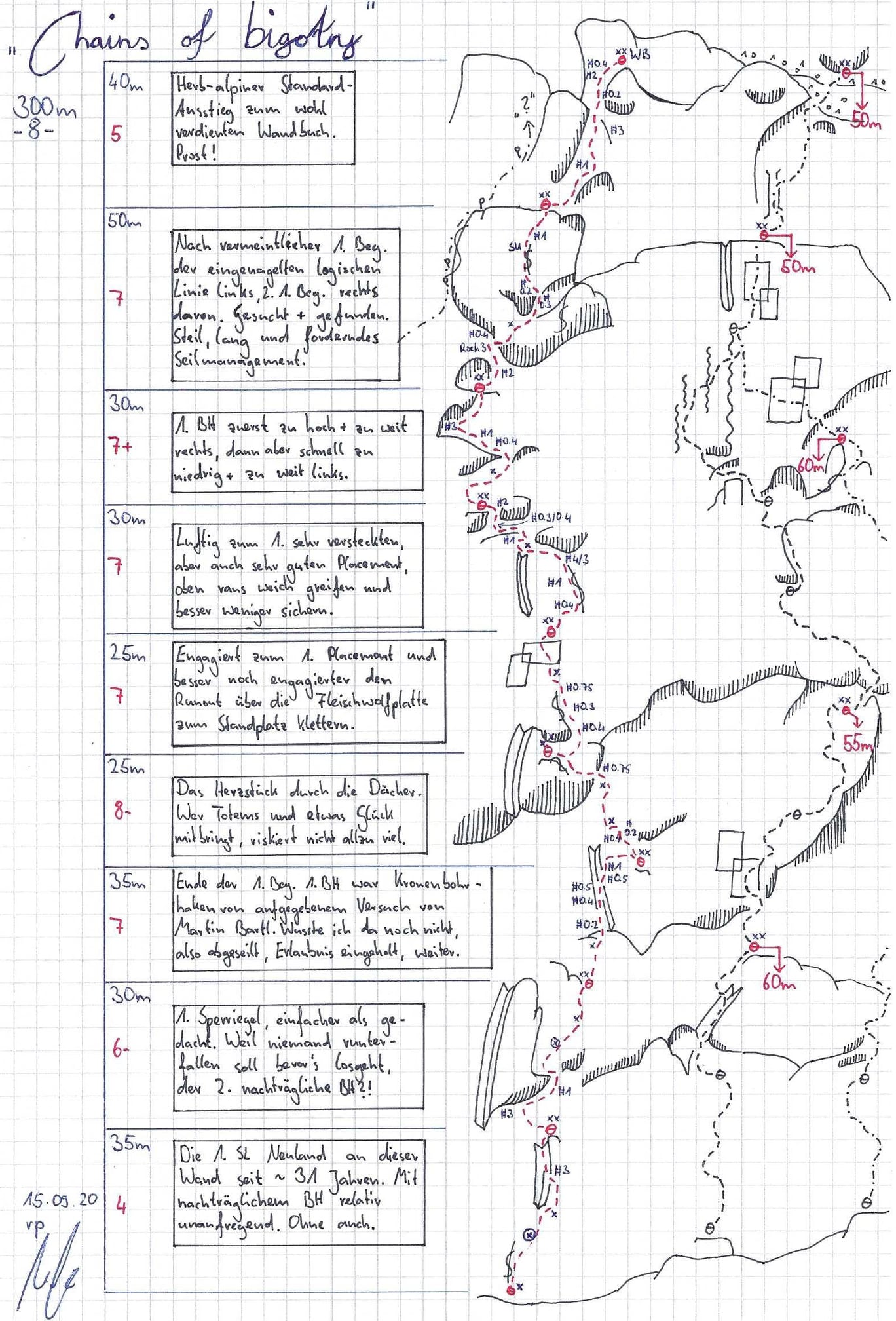 Alle drei Routen bieten nahezu durchwegs Premiumwettersteinkalk, aber ihr Anspruch könnte nach Martin Aussage kaum unterschiedlicher sein. Die schwierigste „Chains of bigotry“ hat mit großem Abstand die weinigsten fixen Absicherungen und die leichteste Route „Peter Lustig – Keine Zeit für Albernheiten“ die üppigste, man könnte vielleicht schon fast an Plaisir denken? Es war Martin ein Anliegen alle Stile dort oben in diesem kleinen Paradies vertreten zu sehen, vielleicht kommt ja auch noch ein 10er ohne einen einzigen Bohrhaken hinzu? Wer weiß, was der Sommer noch so bringt…