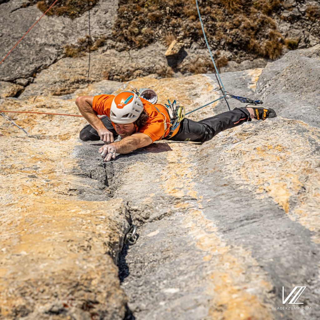 In 2020, the eight pitches of the route „TRADÜNDITION“ on the west face of the Dündenhorn in Switzerland were first climbed by Peter Von Känel and Silvan Schüpbach, and on 15 October 2021 Silvan climbed Redpoint for the first time. In keeping with his first ascent style of using as few fixed belays as possible, the route was first ascended „clean“ despite persistent difficulties. It is probably the most difficult pure trad multi-pitch route in Switzerland. The route has a few fixed pitons and peckers, otherwise it has to be with nuts and friends.