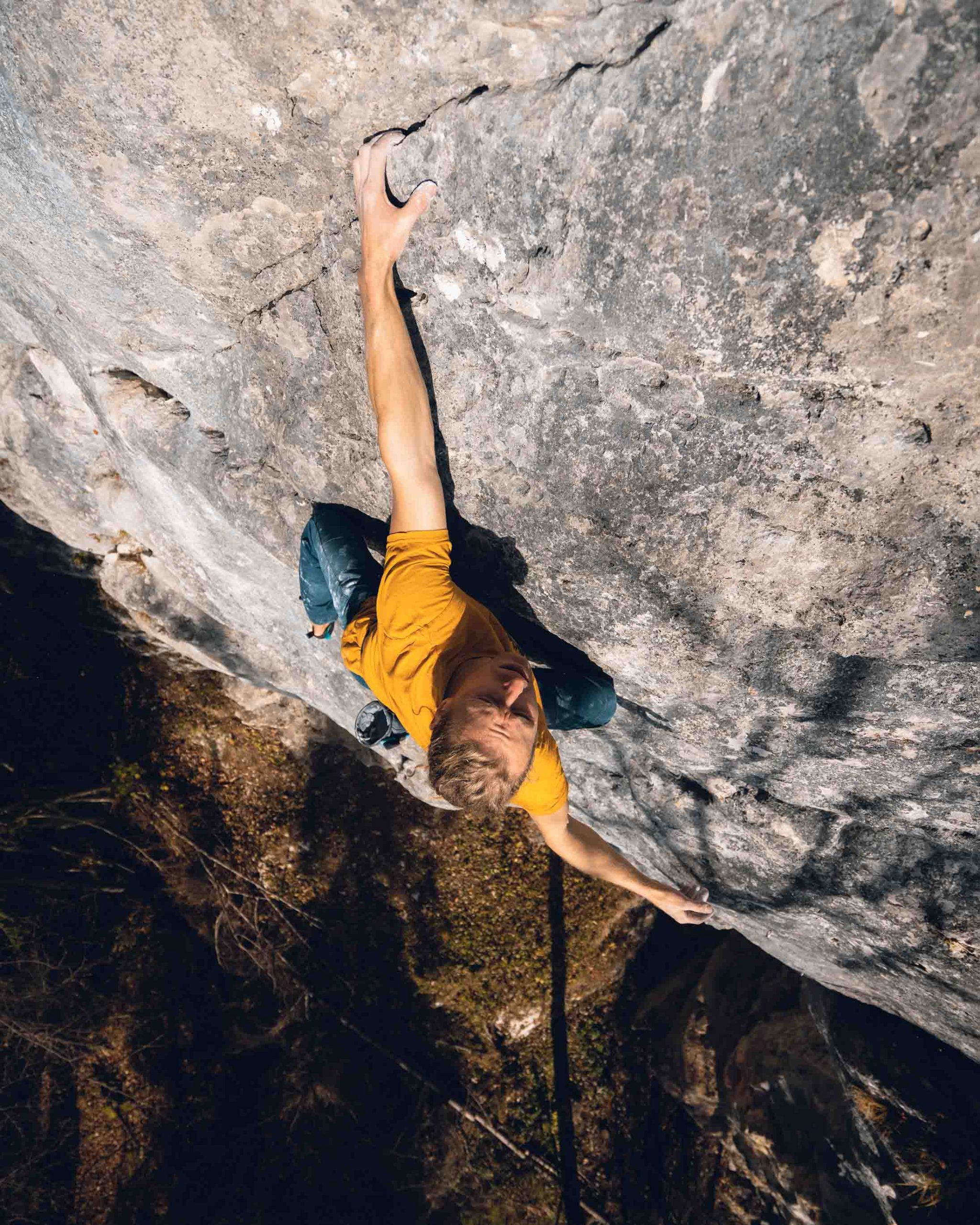 „Der Einstiegsboulder verlangt Fingerspitzengefühl, da es auf die gesamte Länge keinen Rastpunkt gibt. Glasklare Gedanken begleiten mich auf ca. fünf Meter Höhe, wo es einen dynamischen Dead Point Zug auf einen Sloper gibt. Die mentale Crux. Von dort aus überkreuz auf eine Zange mit rechts und eine Mikroleiste links. Weiter mit einem leicht abgerundeten Schulterzug enorm weit links auf einen Sloper. Voila, nur noch den Mantle und schon beginnt das entspannte Klettern wieder.“