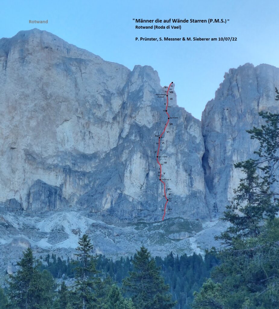 Philipp Prünster, Martin Sieberer und Simon Messner konnten am 10. Juli diesen Jahres in der geschichtsträchtigen Rotwand (Roda de Vaèl) in der Rosengartengruppe in den Dolomiten eine neue Route erstbegehen.
