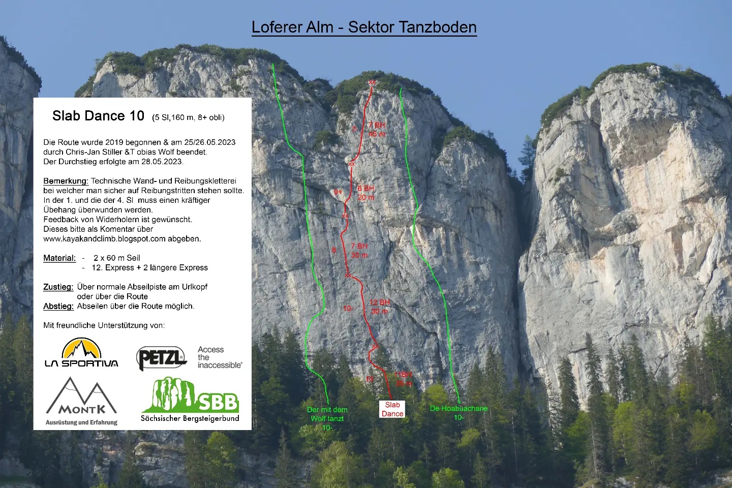 Schon Ende Mai diesen Jahres konnten die beiden Sachsen Chris-Jan Stiller und Tobias Wolf zwischen den Routen „Der mit dem Wolf tanzt“ (X-) und „De Hoabuachene“ (X-) eine neue Toproute an der Loferer Alm im Sektor Tanzboden erschliessen. Die beiden Routen „Der mit dem Wolf tanzt“ (X-) und „Dans op de Deel“ (IX) stammen ebenso von den beiden Erstbegehern.