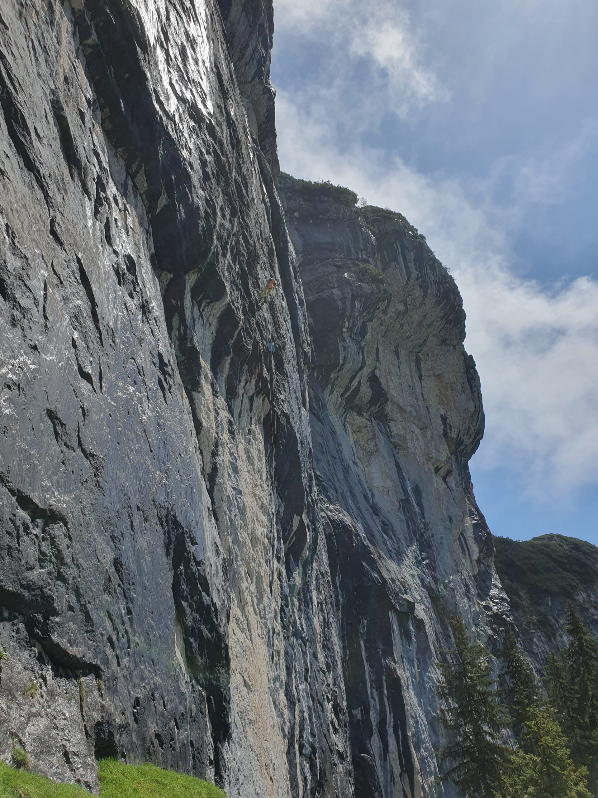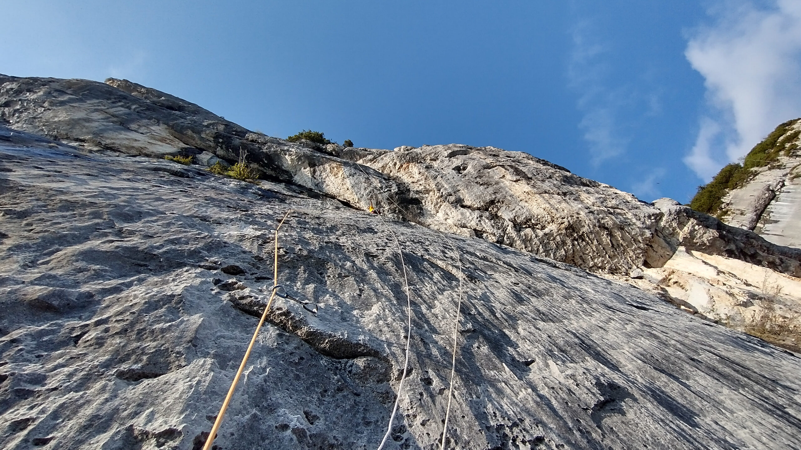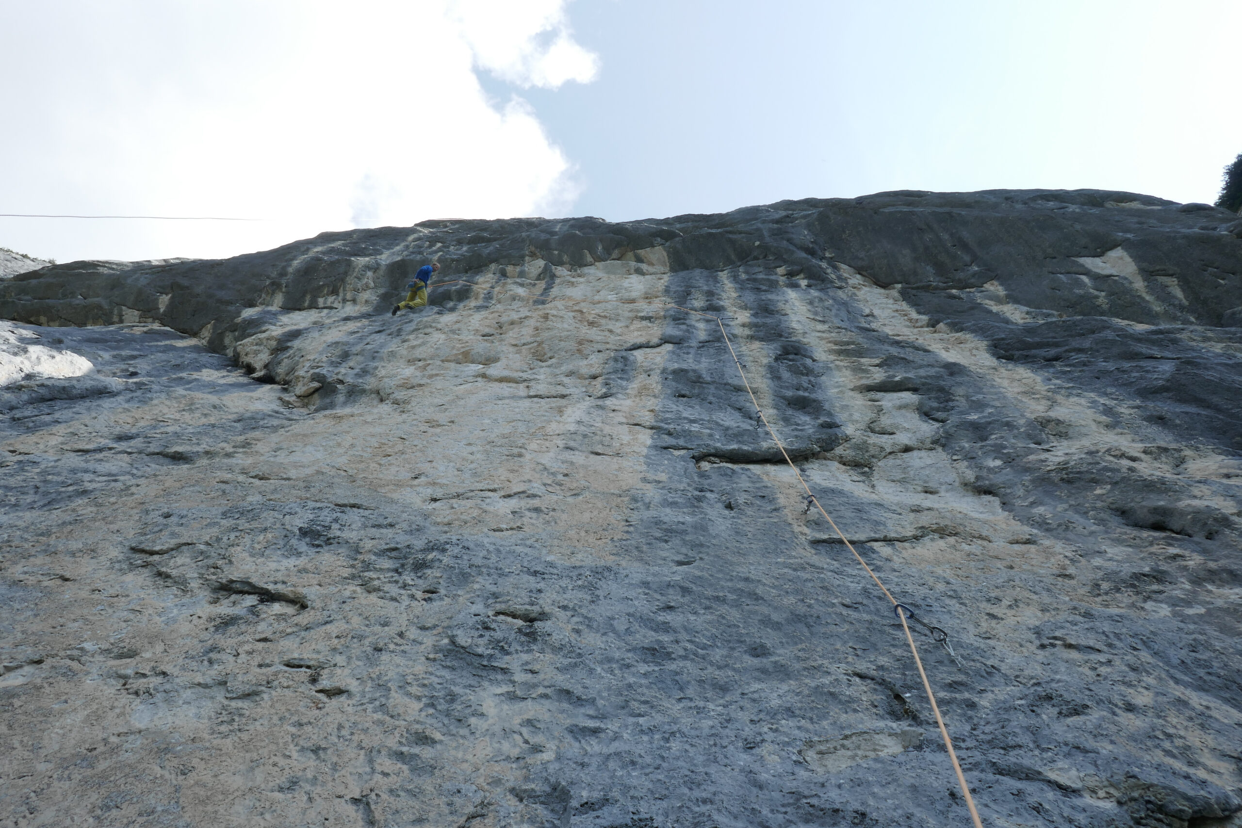 Die neue Route wurde beginnend im Jahr 2019 von unten erschlossen. Nach längere Pause ging es nun Ende Mai zur Sache. Sie bietet technische Wand- und Reibungskletterei, bei dem man sehr sicher auf seine Füßen stehen sollte. In der 1. und in der 4. Seillänge muss eine kräftiger Überhang überwunden werden.