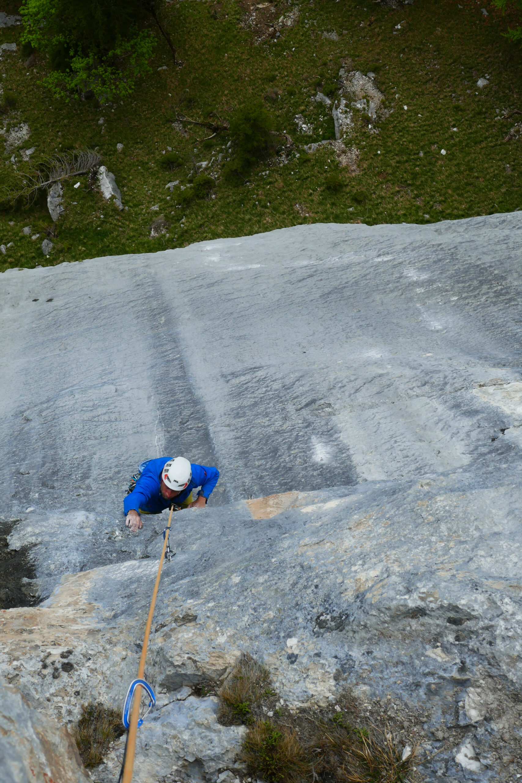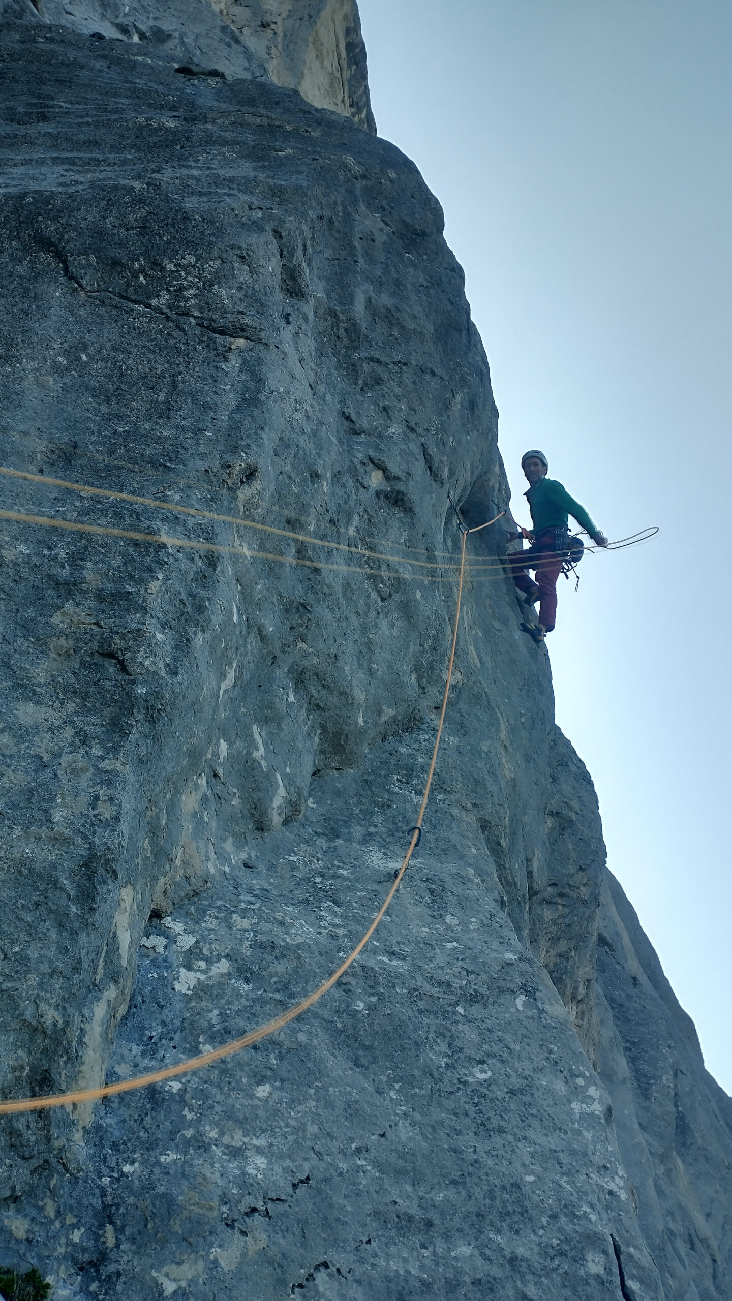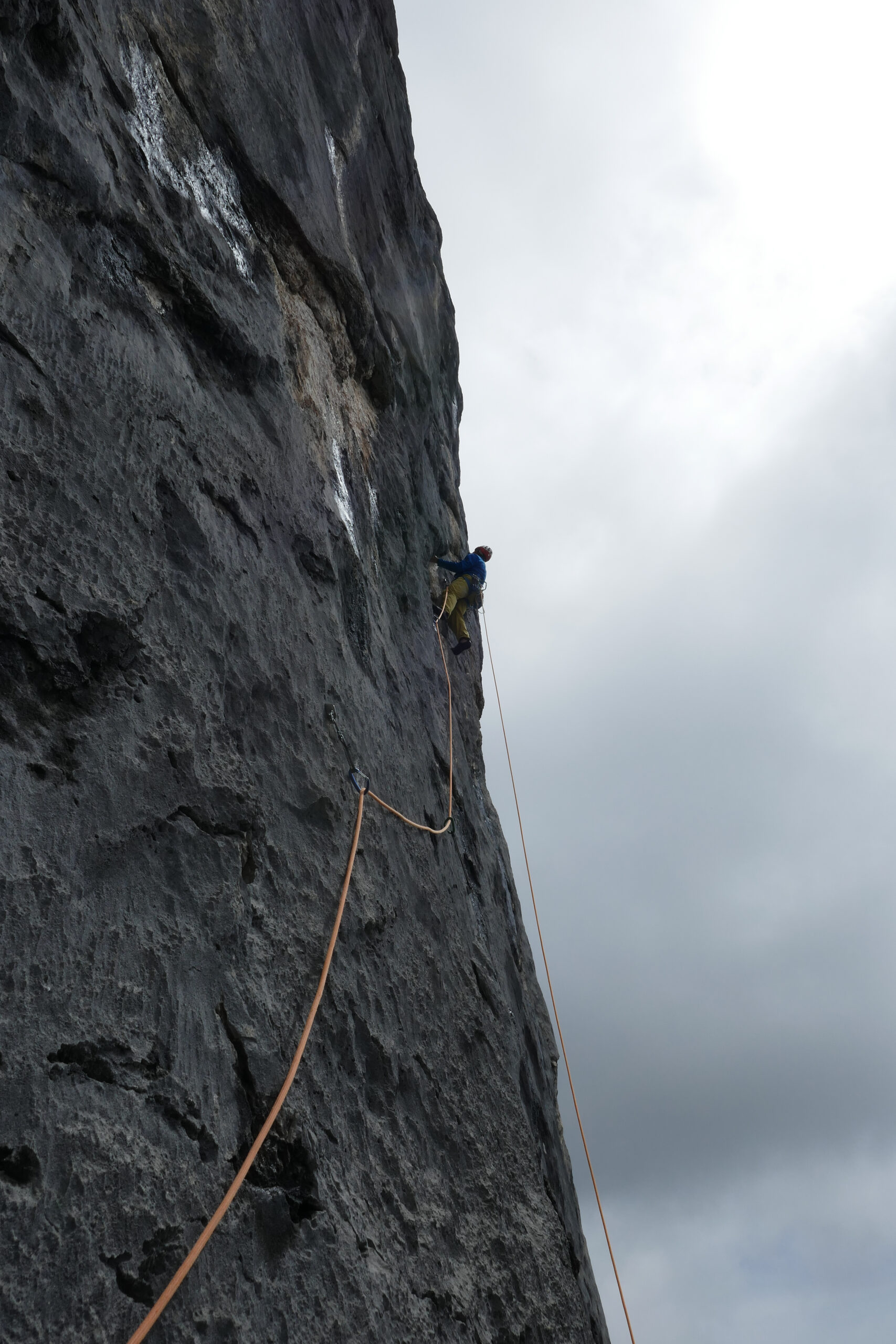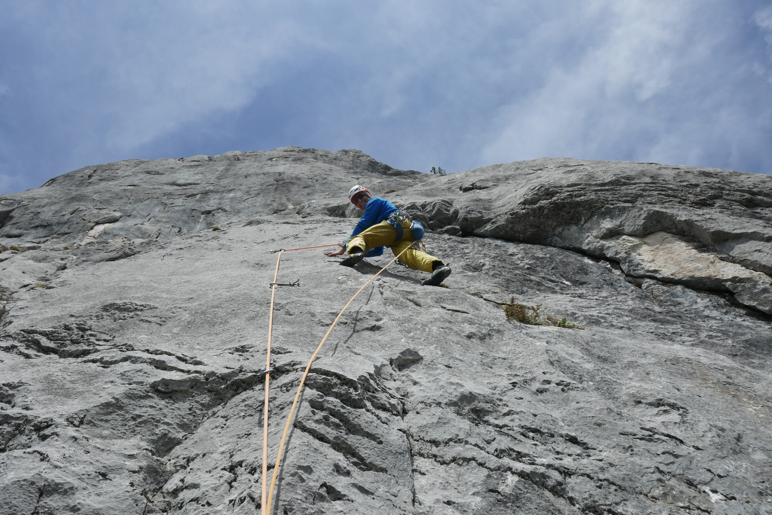 Die neue Route wurde beginnend im Jahr 2019 von unten erschlossen. Nach längere Pause ging es nun Ende Mai zur Sache. Sie bietet technische Wand- und Reibungskletterei, bei dem man sehr sicher auf seine Füßen stehen sollte. In der 1. und in der 4. Seillänge muss eine kräftiger Überhang überwunden werden.
