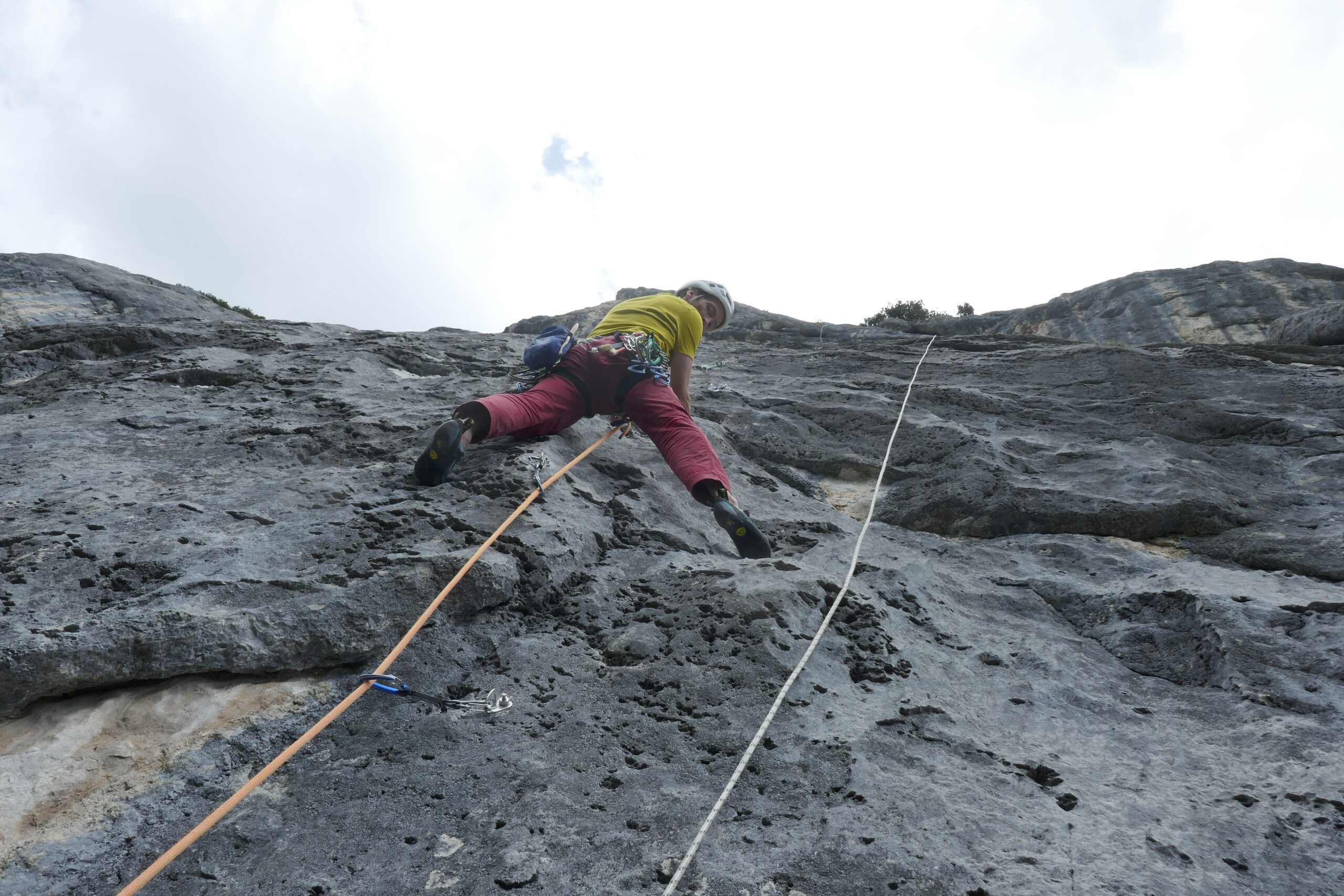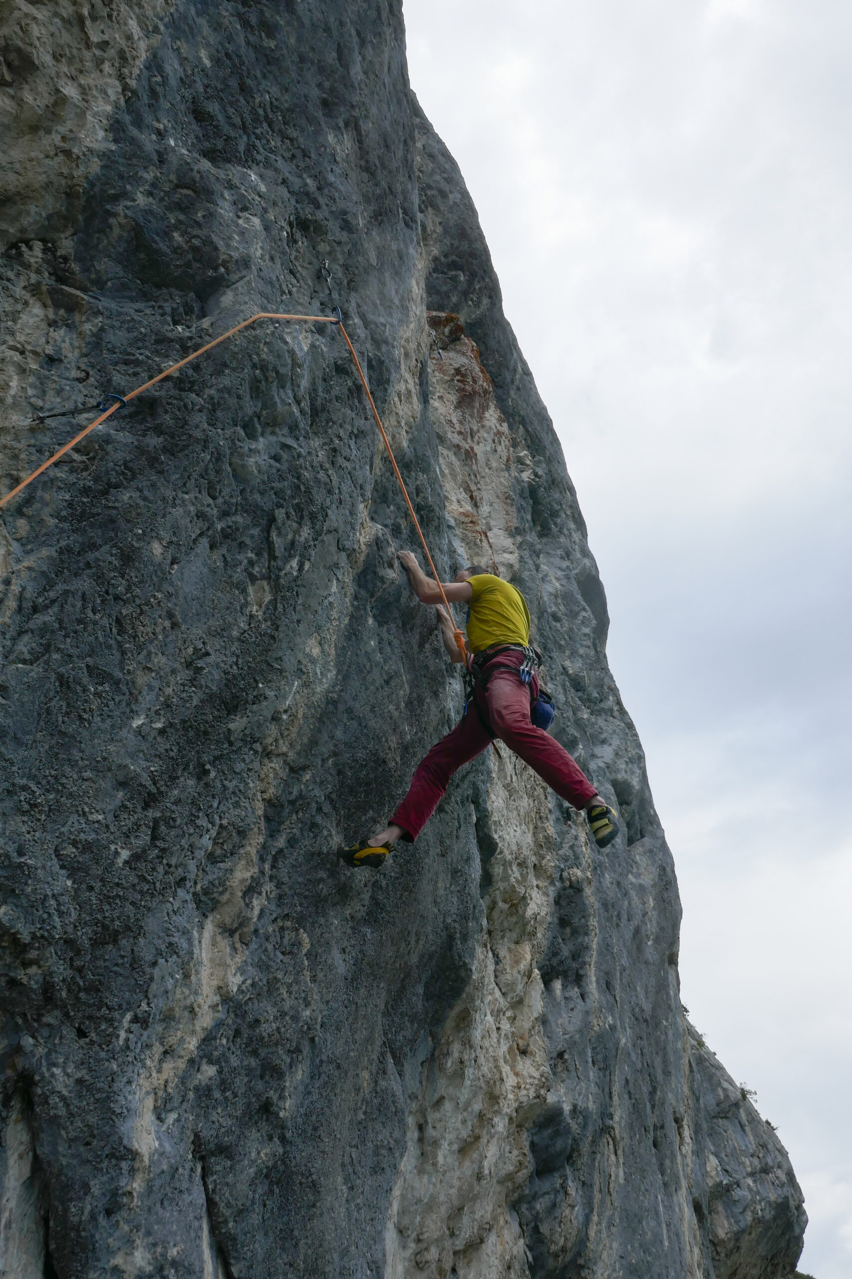 Spannend wurde es noch mal bei der 4. Sl die (9+) über einen großen Überhang geht. Dieses mal war die richtigen Schuhe eher nicht das Problem, denn es gab keine Tritte. Zum Glück waren die Griffe trocken und die Oberarme deutlich erholter als die Unterarme.