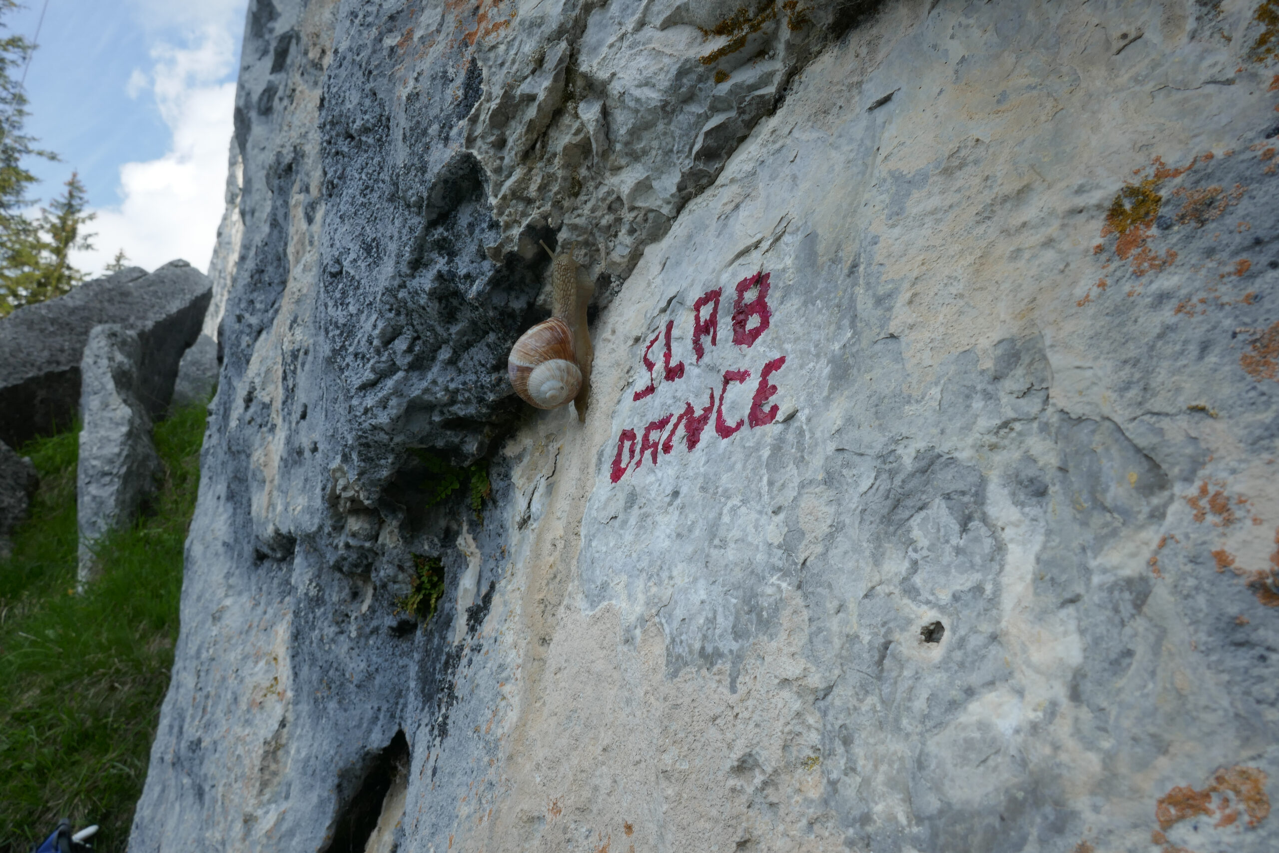 2 Regentage später seilen wir über den Tanzboden ab. 4 Jahre zuvor hatten wir am 8. Haken aufgegeben und die Laschen wieder abgeschraubt. Die Wand war klatschnass und an Klettern war noch nicht zu denken, schon gar keine Steilreibung. Wer schon mal über einen Wasserfall abgeseilt ist, weiß wie glatt nasser Kalk sein kann. Noch dazu wenn er eine dunkelgraue Farbe hat. Diese kommt nämlich von oberflächlichen Verschmutzungen die die Feuchtigkeit länger halten. Leider trocknete es nur langsam, besonders in den Löchern.